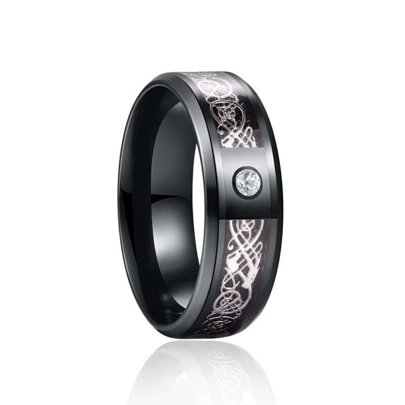 Мужское кольцо из карбида вольфрама 8 мм с узором дракона, инкрустированное красным цирконом, черное углеродное волокно, кольцо для мужчин, обручальное кольцо, оптовая продажа