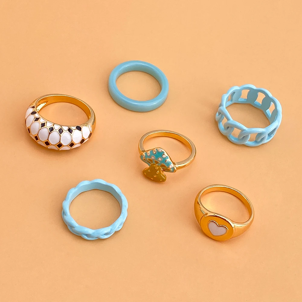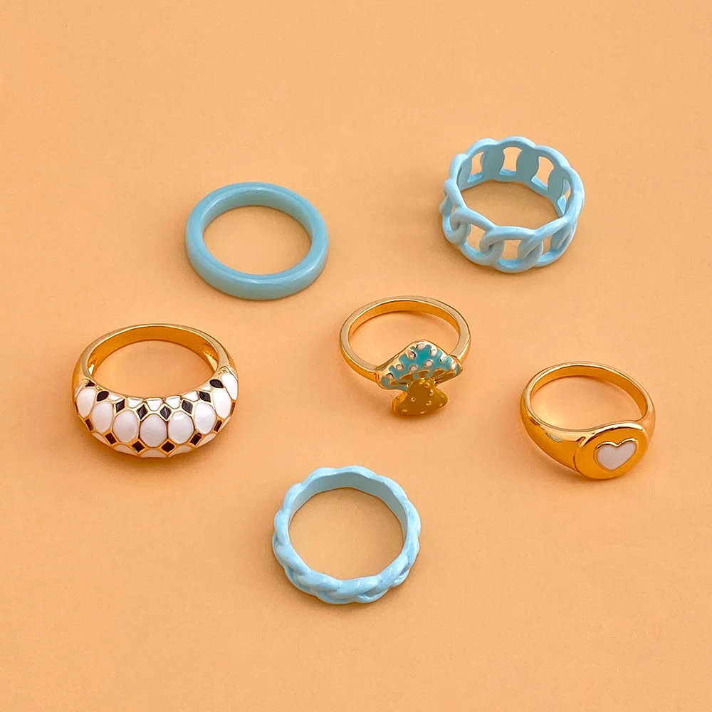 Набор женских колец в винтажном стиле, комплект ювелирных украшений из 6 предметов под золото с цветными вставками в виде грибов, любовных пальцев