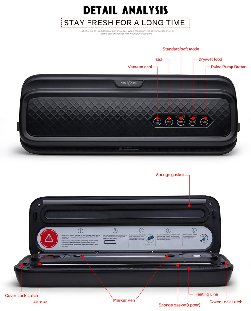 1. Машина не может вакуумно упаковывать жидкость в мешки, может вакуумно запечатывать влажную еду с небольшим количеством влаги.