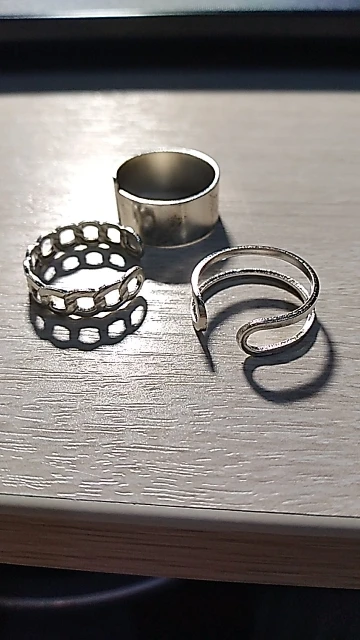 Кольца очень клёвые, но у меня пальцы большеваты, регулируется только одно в моем наборе, его можно натянуть на мой средний палец(18,5), остальные налезают на мизинец и безымянный(он у меня 17-17,5), в общем, сделать как на фотографии продавца с моими пальцами не выйдет, но мне все равно нравится, тем более за такую цену)