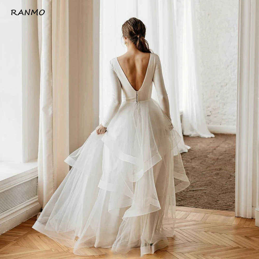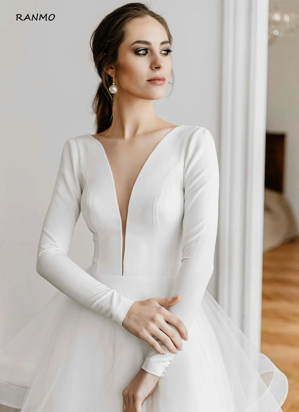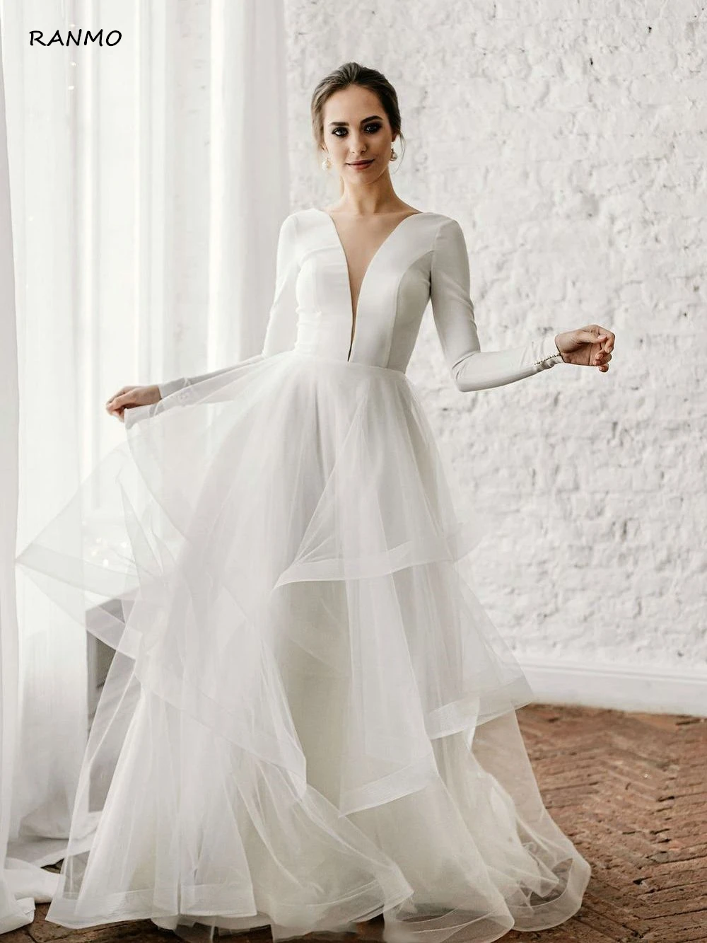 Женское свадебное платье в пол, ТРАПЕЦИЕВИДНОЕ платье с длинным рукавом и V-образным вырезом