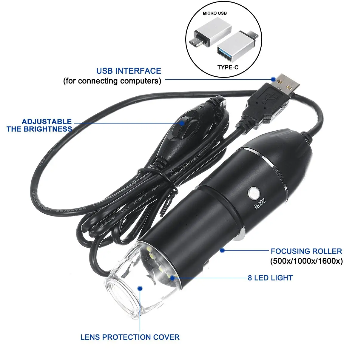 Характеристики:Название продукта: 2-мегапиксельная портативная цифровая лупа для микроскопа с 8 светодиодами и подставкойМатериал: АБС-пластикЦвет: черный/белыйУвеличение: 1600XДатчик: Высокопроизводительный Фоточувствительный чипГлавный чип управления: специальный основной контроль 16 бит DSPФото/видео запись: ВстроенныйСтруктура линз: 2G + IRКамера светильник источник света: 8 регулируемый светодиодный светильникИсточник питания: USB (5 В постоянного тока)Диапазон освещения: 0 ~ 30000LUX регулируется проводомФокусное расстояние: 0 ~ бесконечностьРазрешение камеры: 1920x1080PФормат изображения: JPEGФормат видео: MP43 в 1 : USB + адаптер Micro USB + usb-адаптер Type-CОсобенности:-8 регулируемых светодиодов, сильная яркость, более четкие-Поддержка фотографии-Маленький и портативный-Профессиональный, более универсальный, может быть применен для лабораторных исследований, электронных компонентов, идентификации ювелирных изделий и т. Д.-Портативный, легкий и простой в использовании-Отличная производительность