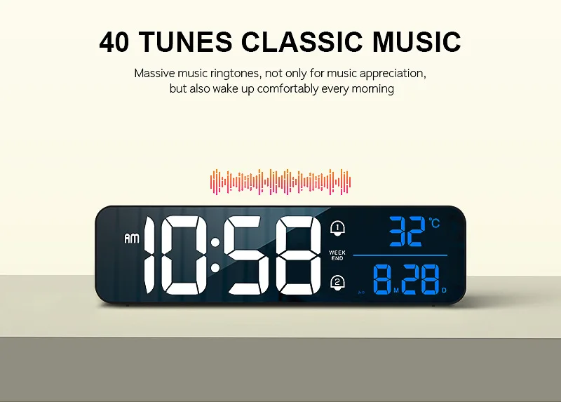 Светодиодный прикроватный часы оснащены 40 различными мелодиями звонка. Вы можете выбрать удобные мелодии будильника, чтобы попрощаться с одним расточным звуком будильника. Объем разделен на 4 уровня, что позволяет установить наиболее комфортный уровень. Не нужно беспокоиться о том, что звук настолько громкий, что раздражает вас или слишком слегка разбудит вас от глубокого сна.