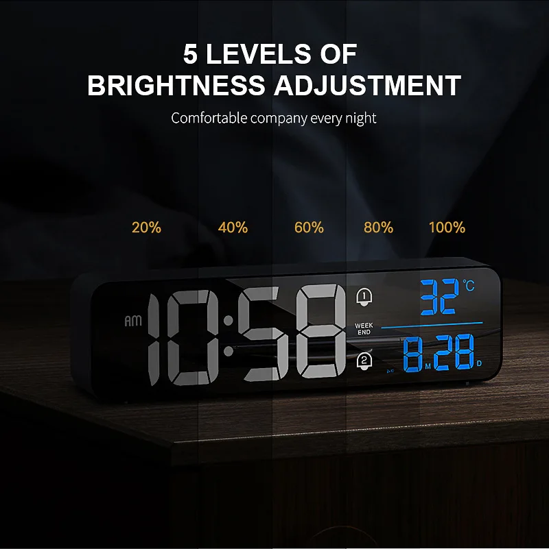 Наша сигнализация clcok имеет 5 уровней яркости, 20%,40%,60%,80% и 100%,5 уровней регулировки яркости, удобная компания каждую ночь, вы можете вручную регулировать яркость. Защищает ваши глаза ночью и экономит энергию. 12 или 24 часа системы может быть изменен. Эти светодиодные часы имеют функцию памяти, все настройки будут запоминаться. Он очень подходит для спален, офисов, гостиных и кухни.
