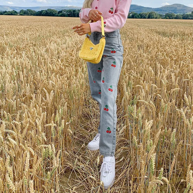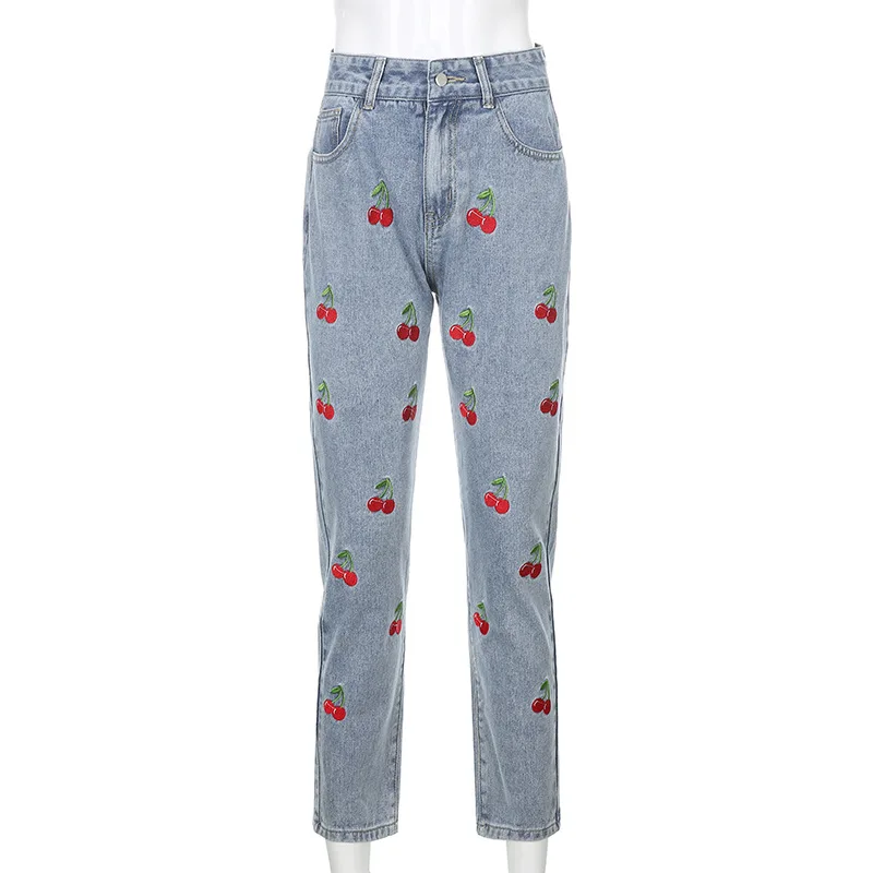 Милые женские джинсы Y2K с высокой талией, прямые джинсовые брюки с вышивкой вишни, джинсы для мам, Новинка осени 2021, модные облегающие джинсовые брюки