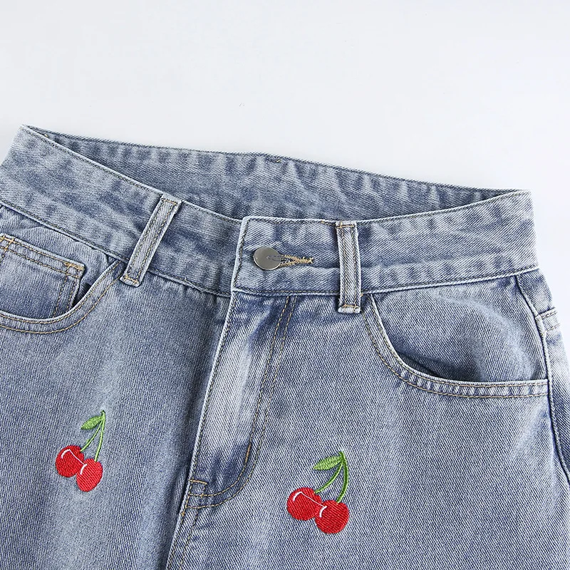 Джинсы женские Darlingaga, голубые прямые, с вышивкой в виде вишни,...