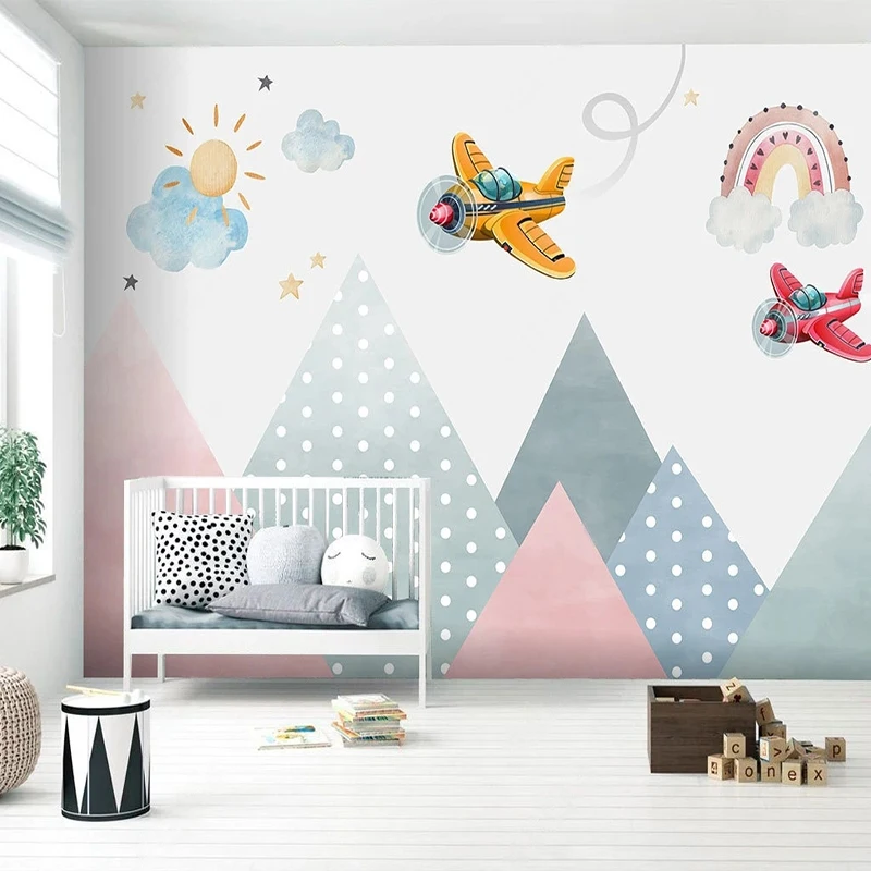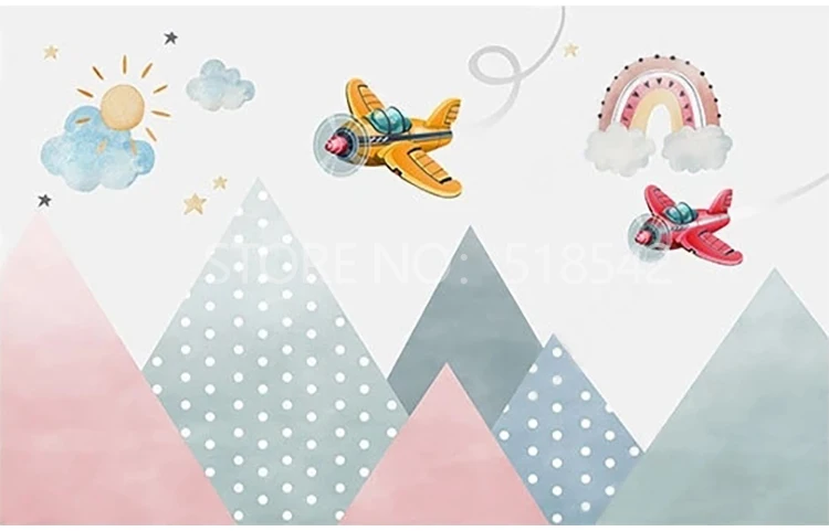 Настенные 3D обои на заказ, наклейки на стену с мультяшным самолетом, с геометрическим рисунком гор, пиков, для детской комнаты, дома и украшения