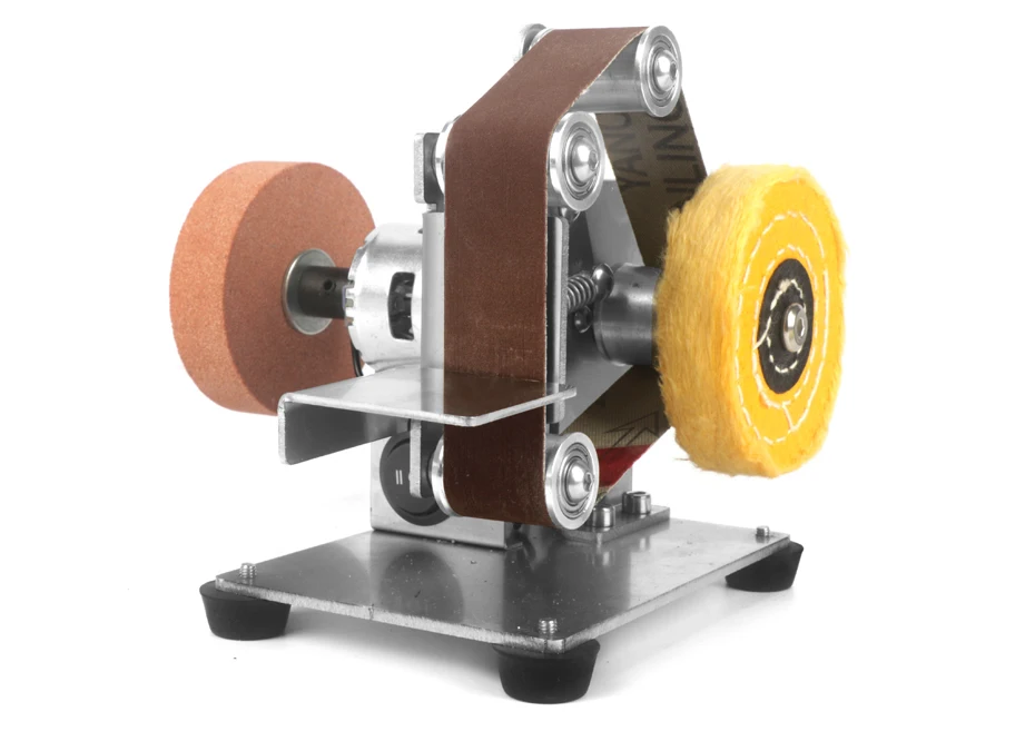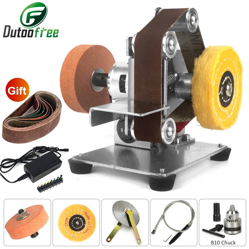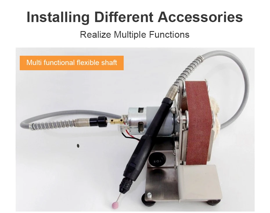 Это многофункциональный ленточный шлифовальный станок, мини портативный, низкий уровень шума, может использоваться для высокоскоростного стального сверла грубого шлифования, кромки лезвия, тонкого шлифования вольфрамовой стали токарного инструмента, полировки корень дерева Бодхи и т. Д., простой в установке и эксплуатации, это домашний инструмент DIY.