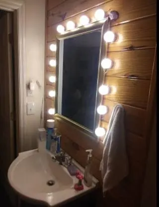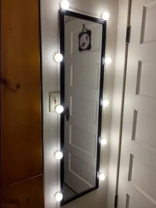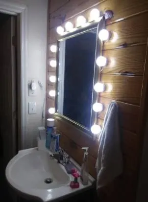 Мне нравятся эти огни. Очень хорошая цена. Длину между каждым из них можно регулировать, поворачивая их на основании. Они имеют много различных светильников и блесток. Я купил Безрамное зеркало Lowe's и наклеил их на него