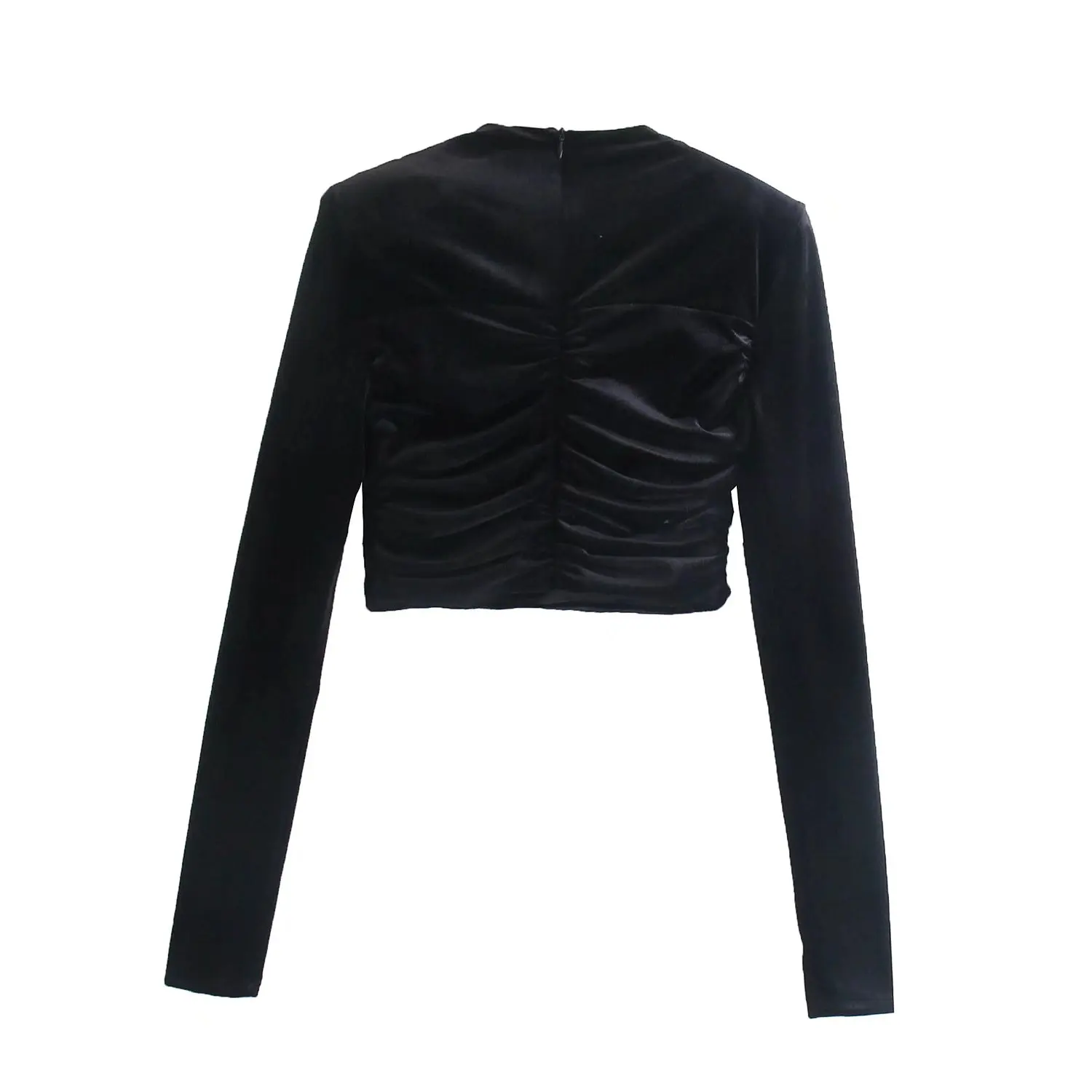 Willshela женский черный бархатный топ с подплечниками круглый вырез Длинные рукава спереди плиссированные детали шикарный женский укороченный топ