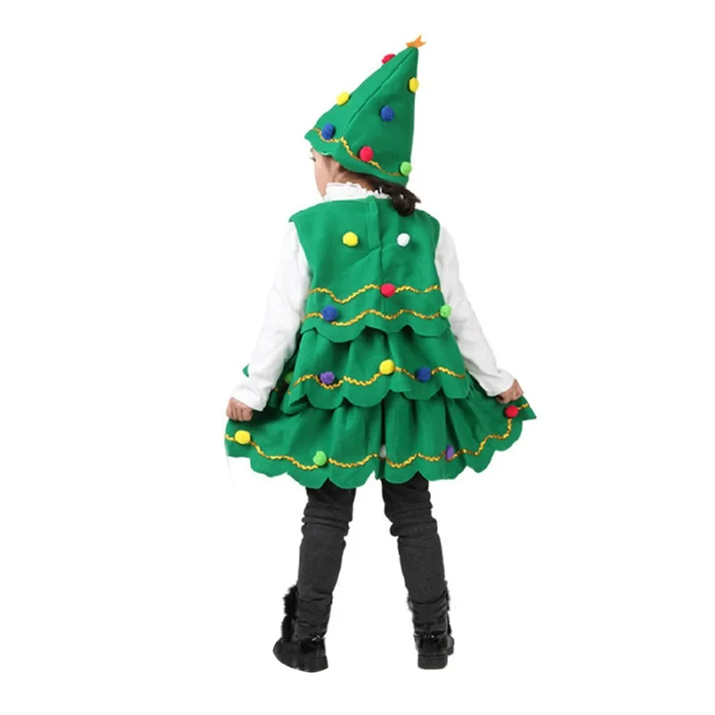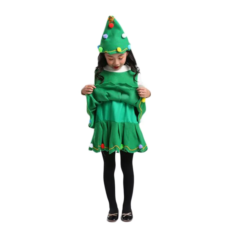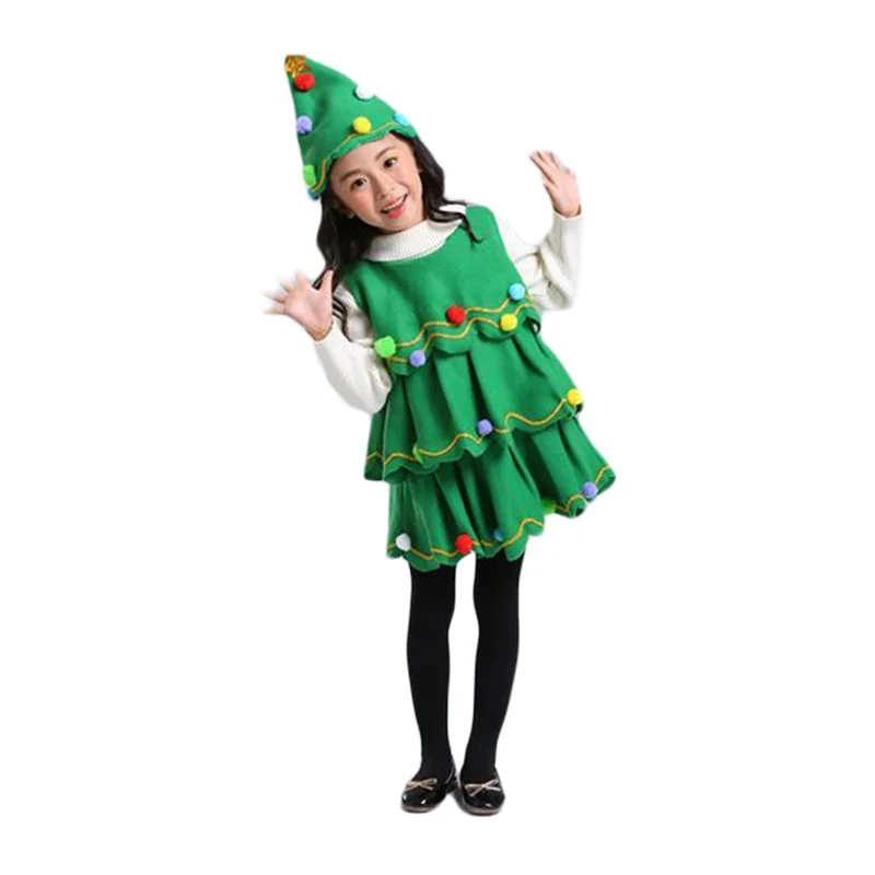 Детский Рождественский костюм, детская одежда, платье без рукавов, шапка, Рождественская елка, украшение с меховым помпоном, праздничная детская одежда