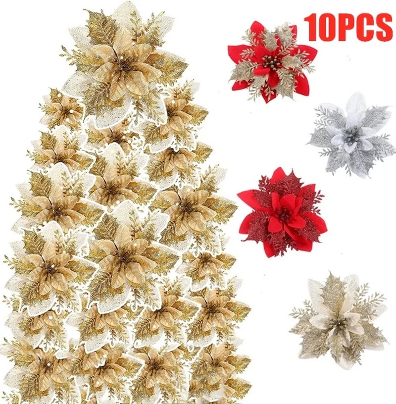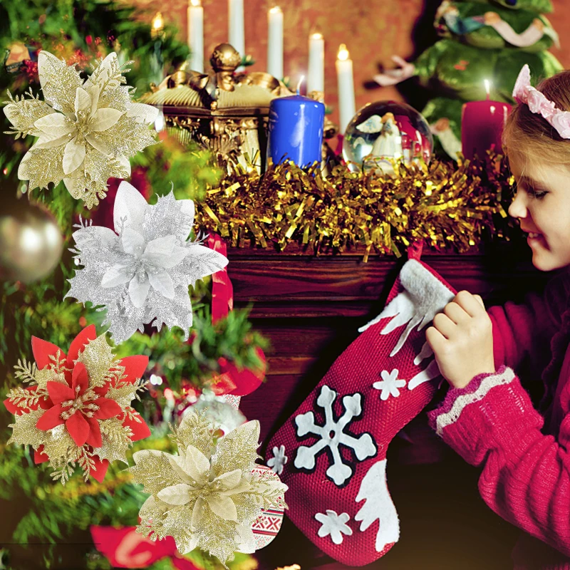 Искусственные Рождественские цветы, 5 шт., блестящие искусственные цветы, украшения для рождественской елки, домашние подарки сделай сам на Рождество, украшение 2021