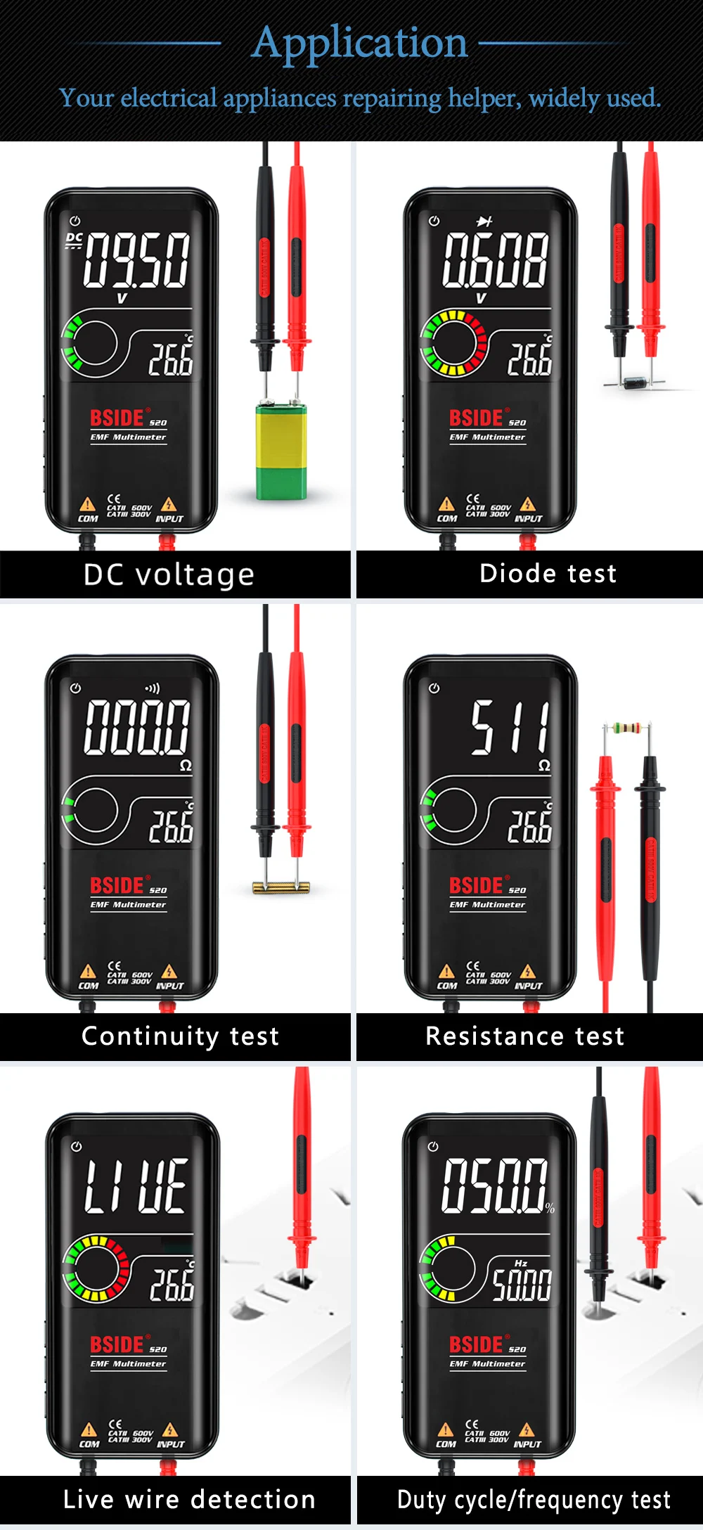 Характеристики: Наименование товара: мультиметрБренд: BSIDEРазмер:143.4x70.9x15.7мм Цвет: черный/красный Дисплей: 9999 подсчетовЭкран: 3,5 дюйм (ов)Разрешение: 0,11 Ом S10 Мощность: 1,5 в (ААА) x 2 (не прилагаются)Диод: Автоматическое определение диода в тех случаях, когда менее чем 3,0 VDC Напряжение: 0,8 V-620V ±(0.5% + 3), Разрешение: 0,001 VAC Напряжение: 2,2 V-620V ±(0.5% + 5), Разрешение: 0,001 VСопротивление: 1Ω-999.9Ω ±(2.0% + 5), 1k60-60mΩ ±(1.0% + 3)V-оповещение (Бесконтактное Обнаружение напряжения): звуковой сигналПроверка в режиме реального времени: звуковой сигнал тревоги, полоса дисплея ЖК-экранаНепрерывность: если сопротивление менее 30 Ом, звуковой сигналРабочий цикл: 0.1%-99.9% ±(3.0% + 5) (переменный ток: 2 в-620 в), разрешение: 0.1%Емкость: 1nF-999.9nF ±(6.0% + 5), 1uF-99.99mF ±(3.0% + 3), разрешение: 0.001nFЧастота:1 Гц-1000 Гц ±(1.0% + 5) (переменный ток: 2 в-10 В); Разрешение: 0,001 Гц1 кГц-60 кГц ±(1.0% + 5) (переменный ток: 10 В-620 в); Разрешение: 0,001 Гц Примечание: -Возможны отклонения в размере от 1 до 3 см при ручном измерении. -Отклонение цвета может отличаться из-за различных настроек монитора, пожалуйста, поймите.