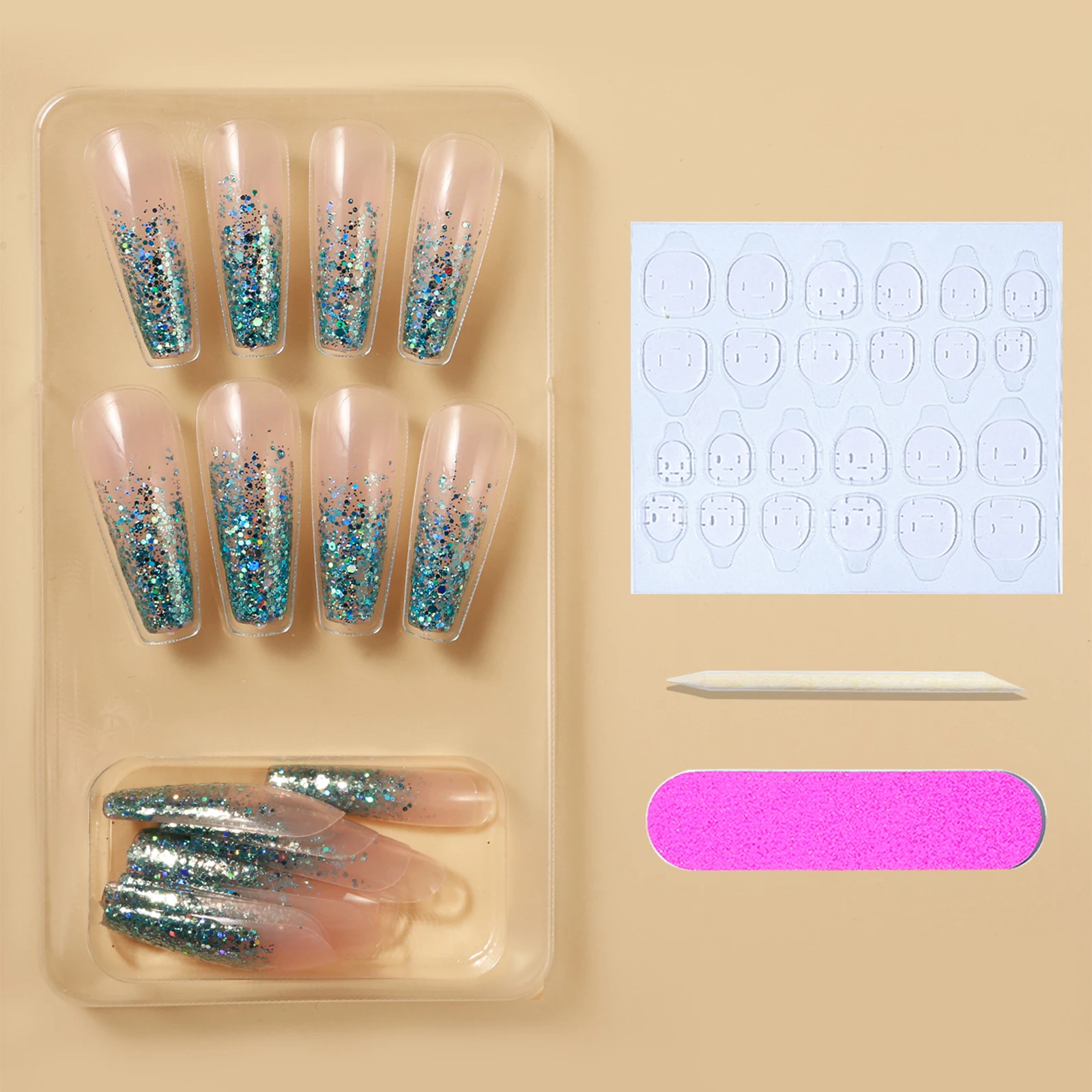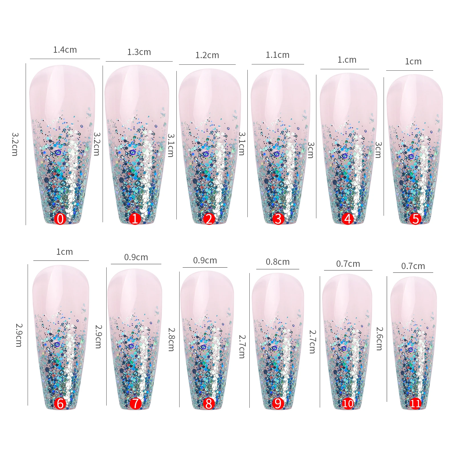 Синие блестки с дизайном сверхдлинные накладные ногти французская б...