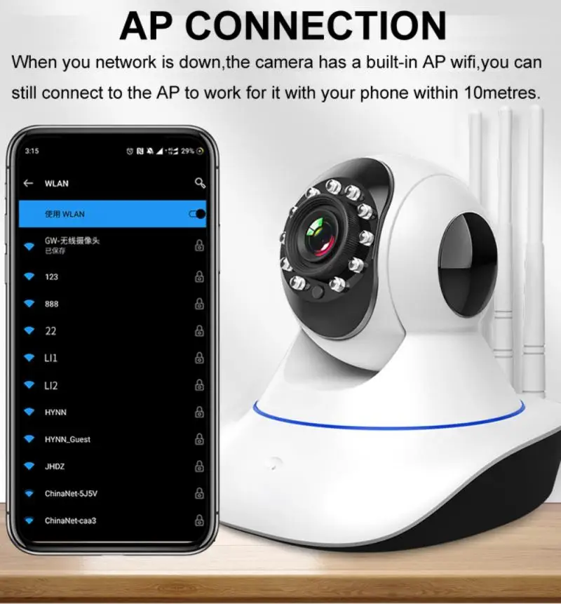 【Поддержка режима подключения AP 】если ваша сеть выключена, камера имеет встроенный AP wifi, вы все равно можете подключиться к AP для работы с телефоном в течение 10 метров.