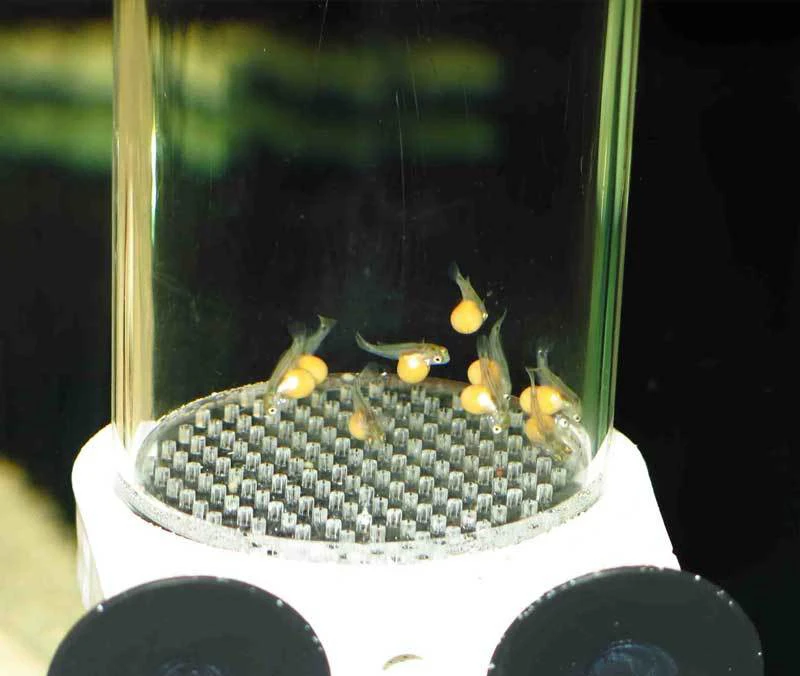 Этот инкубатор для рыб позволяет пресной воде циркулировать над яйцами цихлида, которые были отделены от родителей.