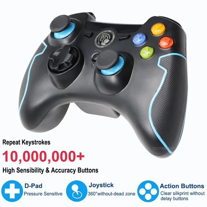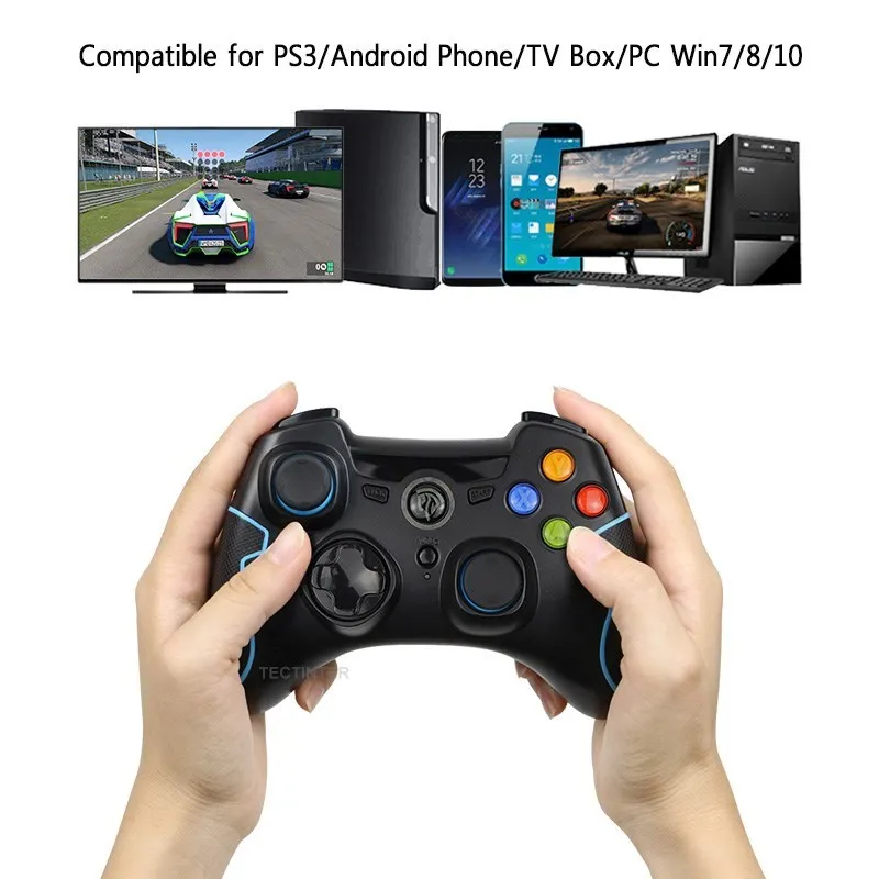 Этот игровой контроллер не имеет функции Bluetooth, используя зрелую технологию беспроводной передачи 2,4G! Превосходное автоматическое подключение. Использование высокопроизводительных чипов, геймпад в игре имеет лучшую стабильность, высокоточные рокеры 360 °, задержка почти равна нулю, поддерживает все виды устройств android. Поддержка ПК, ТВ-бокса, смартфона Android, PS3 и т. д. с дизайном кривой человеческого тела, вы не будете чувствовать усталость, даже если вы зависимы от игры в течение длительного времени