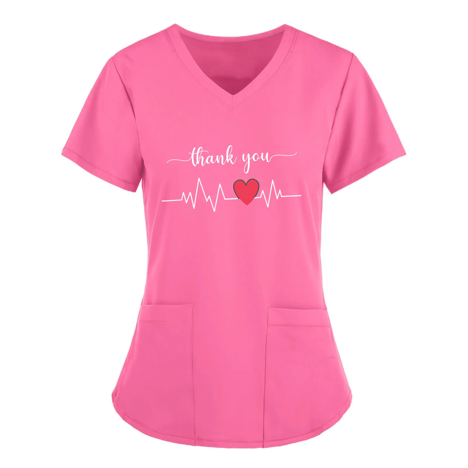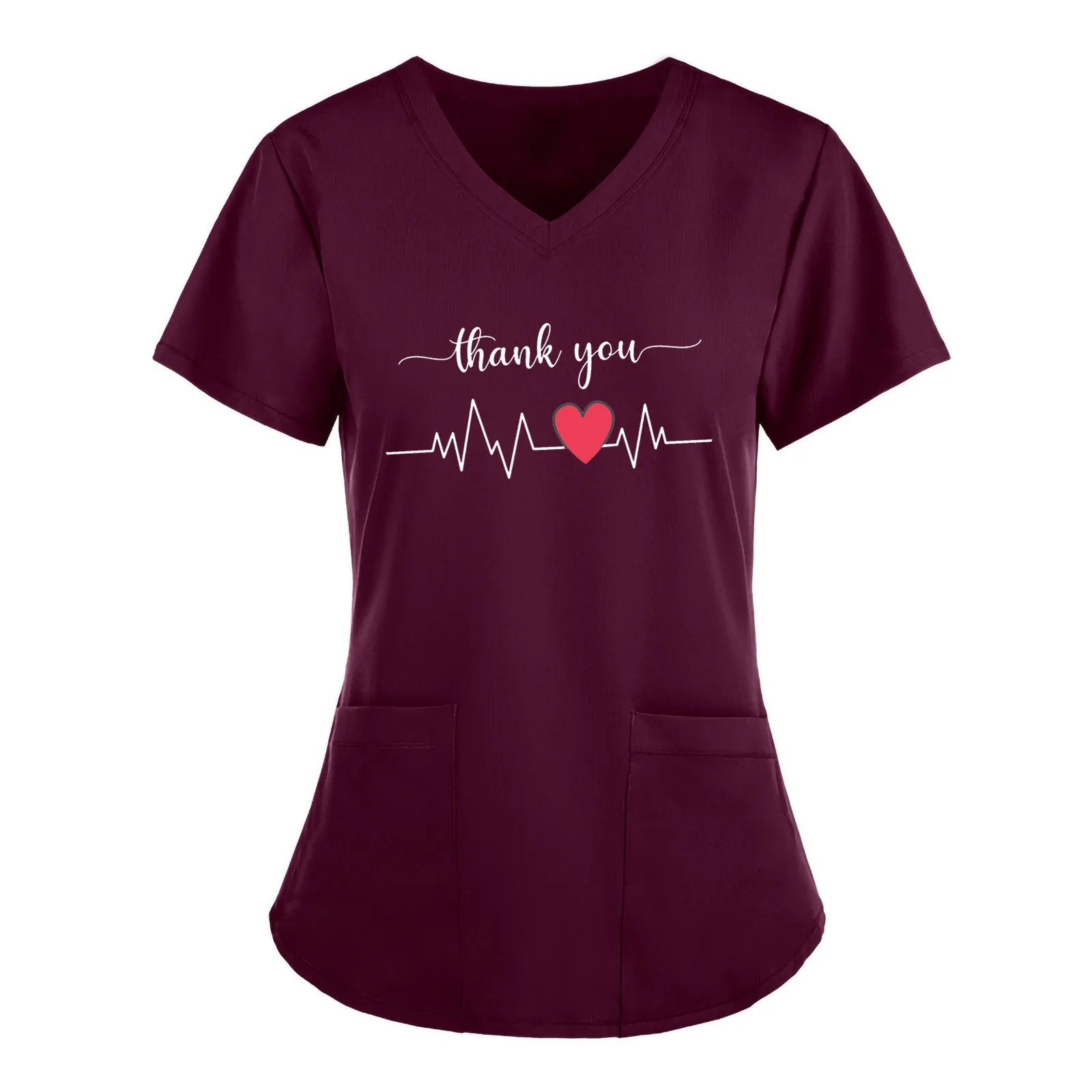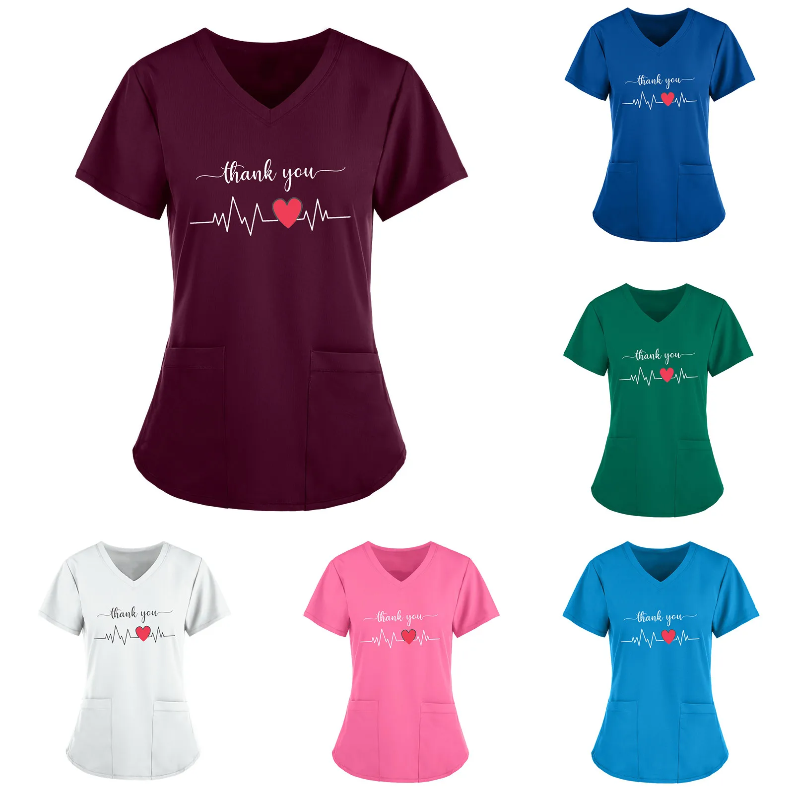 Униформа медсестры с надписью размера плюс, Женские топы с коротким рукавом и V-образным вырезом, Рабочая Униформа, однотонная, с карманами