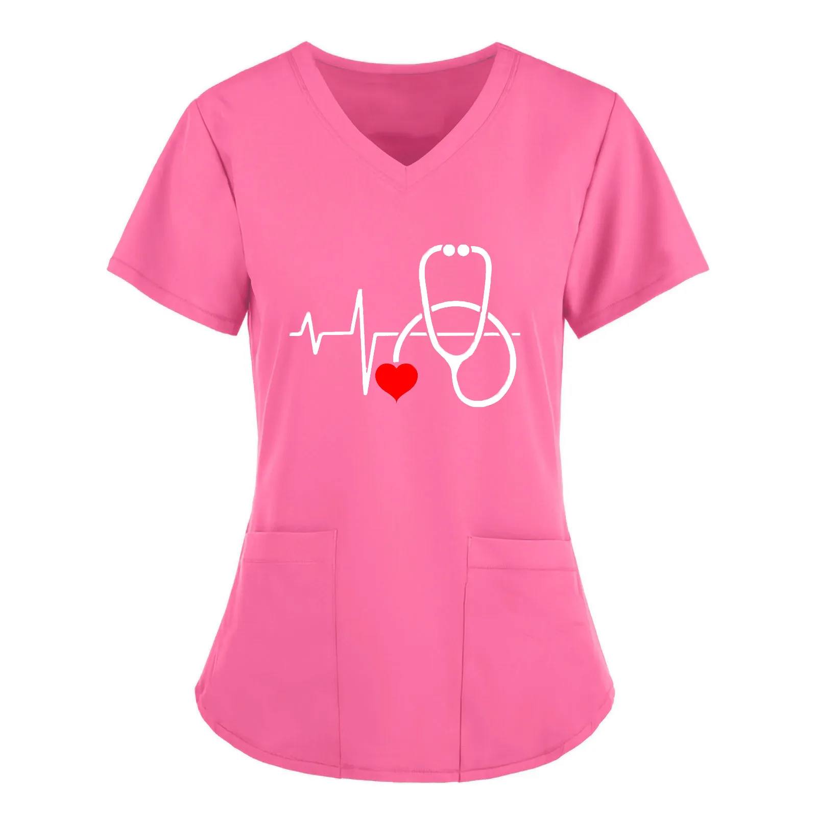 Униформа медсестры с рисунком размера плюс, женские топы с коротким рукавом и V-образным вырезом, однотонная Рабочая Униформа с карманами аксессуары для медсестер