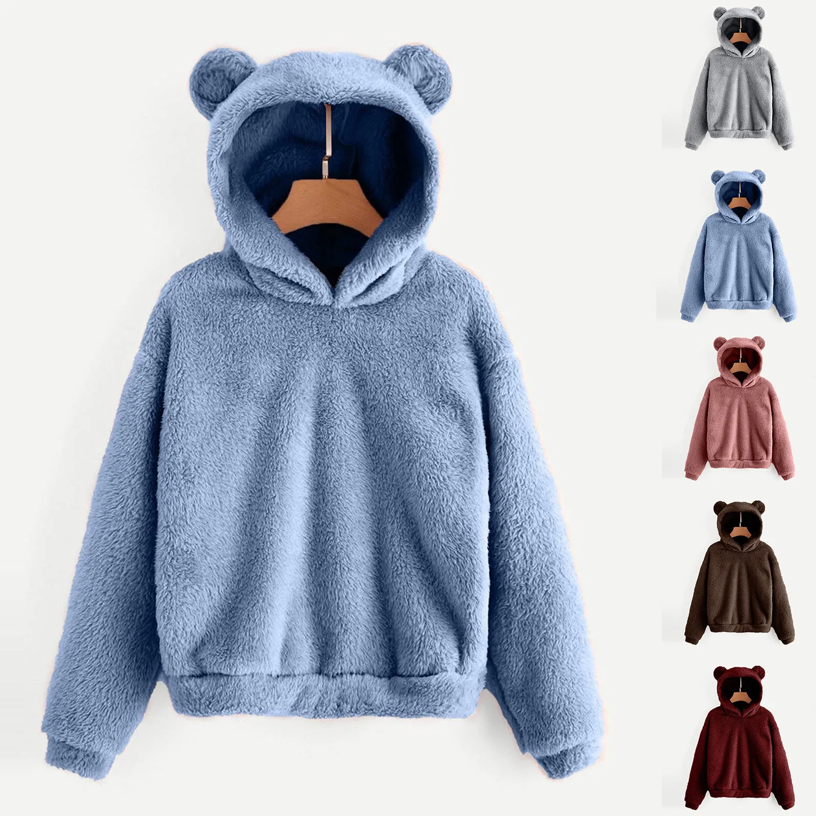 Женская флисовая толстовка с длинным рукавом, теплый Пушистый пуловер с капюшоном в форме медведя и карманом