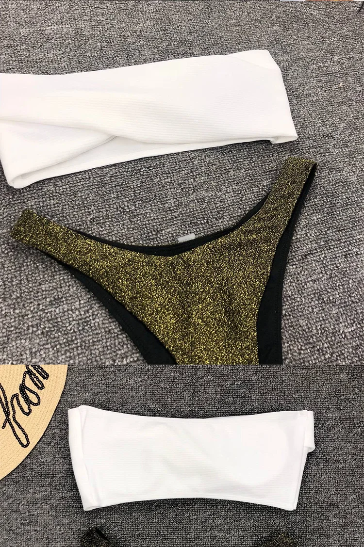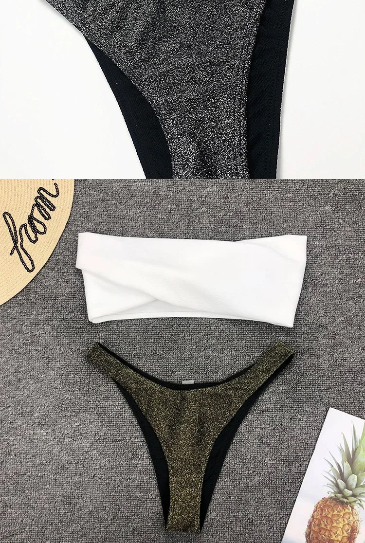 Однотонный Блестящий купальный костюм-бандо, новинка, женский сексуальный купальный костюм с прострочкой, комплект эластичного лоскутного бикини с открытой спиной и ремешками