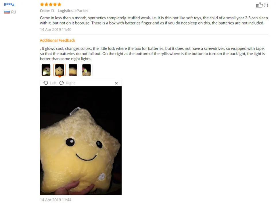 Условия: 100% Новые Размер: звезда: 35 см Вес: 250 г Материал: плюш Упаковка: 1 шт. в полиэтиленовом пакете (без батарей)