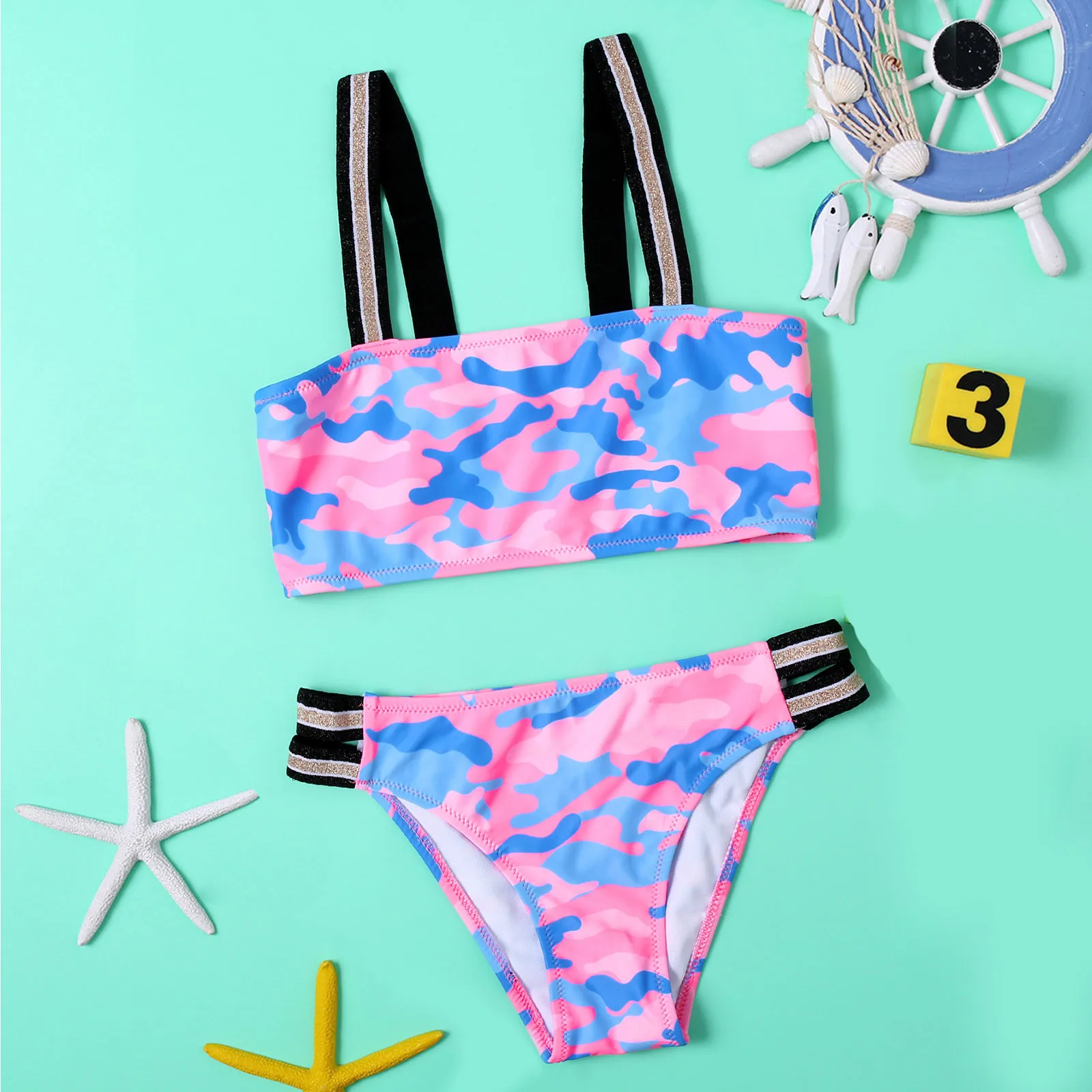 TELOTUNY, детские купальники для девочек, лето 2021, без рукавов, Камуфляжный цвет, купальник из двух частей, комплект бикини, детская пляжная одежда