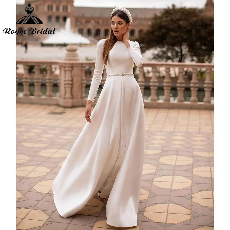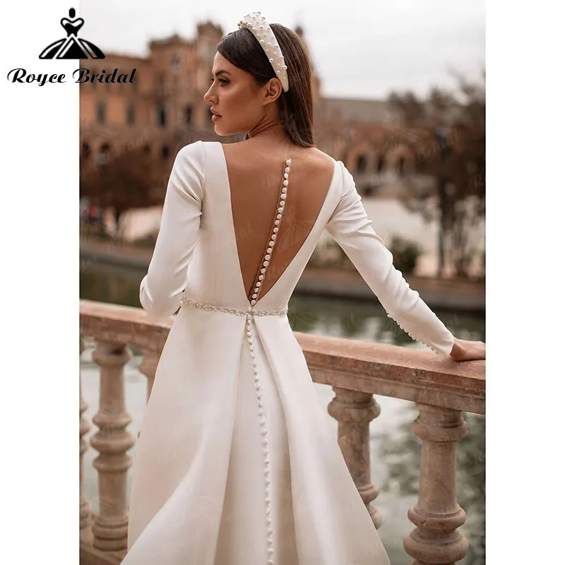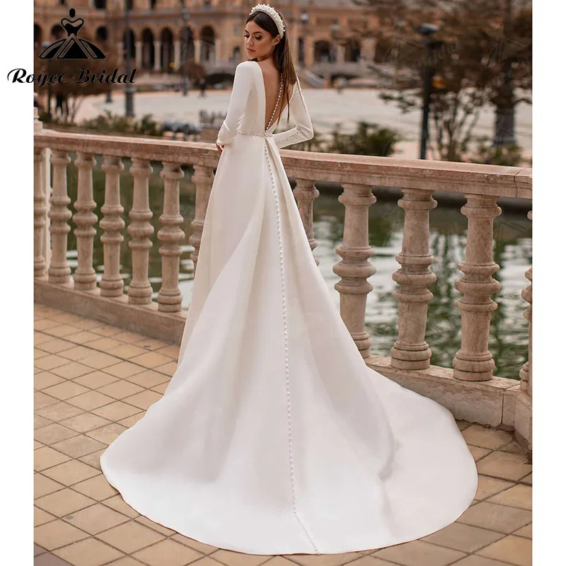 Простое ТРАПЕЦИЕВИДНОЕ свадебное платье с пуговицами, сатиновое платье с открытой спиной и шлейфом, платье невесты с длинным рукавом, свадебные платья 2022