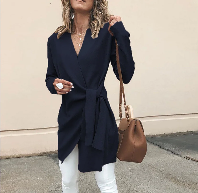 Женское шерстяное пальто в стиле Харадзюку, элегантное однотонное пальто с поясом и V-образным вырезом, Офисная верхняя одежда в винтажном стиле, 2021