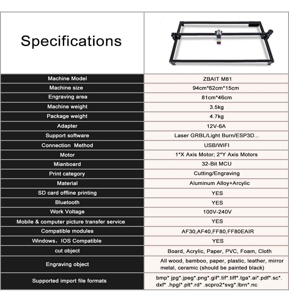 Машина может быть совместима с различными зрелыми гравировальными программами, такими как LaserGRBL, LightBurn, поддержка Win XP / Win 7 / Win 8 / XP / Win 10, а также поддержка системы MACs (LightBurn), формат гравировки файлов поддерживает NC, BMP, JPG, PNG, DXF и т. Д.