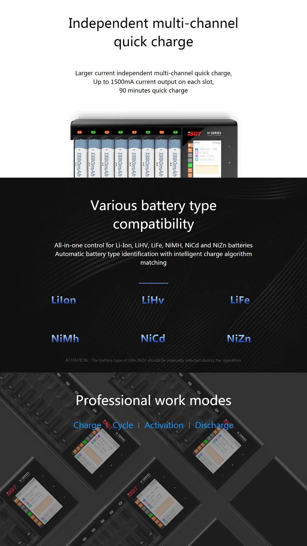 Независимая Многоканальная быстрая зарядка большой ток независимая Многоканальная быстрая зарядка, до 1500ма выходной ток на каждом слоте, быстрая зарядка 90 минут