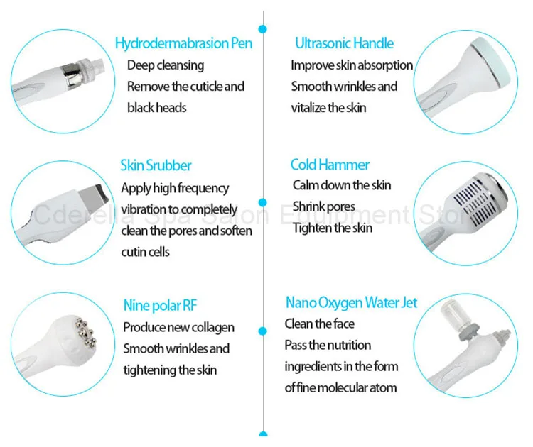 A. Полимерная распылительная Ручка: увлажняет, быстро проникает в кожу и повышает жизненную силу кожи.B. Ультразвуковая Ручка: от 10 до 3 миллионов вибраций, глубокое проникновение и ремонт нижней части кожи.C. Ручка холодного молотка: отбеливает и омолаживает кожу, сужает поры и уменьшает чувствительностьD. Ручка скруббера кожи: удаляет омертвевшую кожу, улучшает излишки кутикулы и тонкую кожу.E.Hydra ручка для дермабразии: глубокое очищение, удаление жира, черных точек, акне, грязи и Повышение эластичности кожи.F. Подъемная головка: стимулирует коллаген, подтягивает и подтягивает кожу
