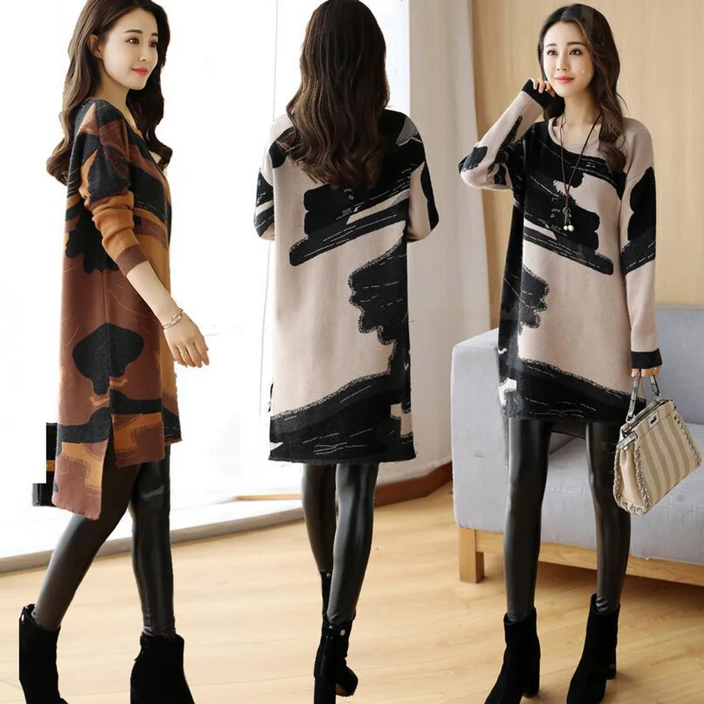 Модное простое женское осенне-зимнее платье с принтом холодного цвета Свободное прямое мини-платье большого размера с круглым вырезом и длинным рукавом vestidos #2838
