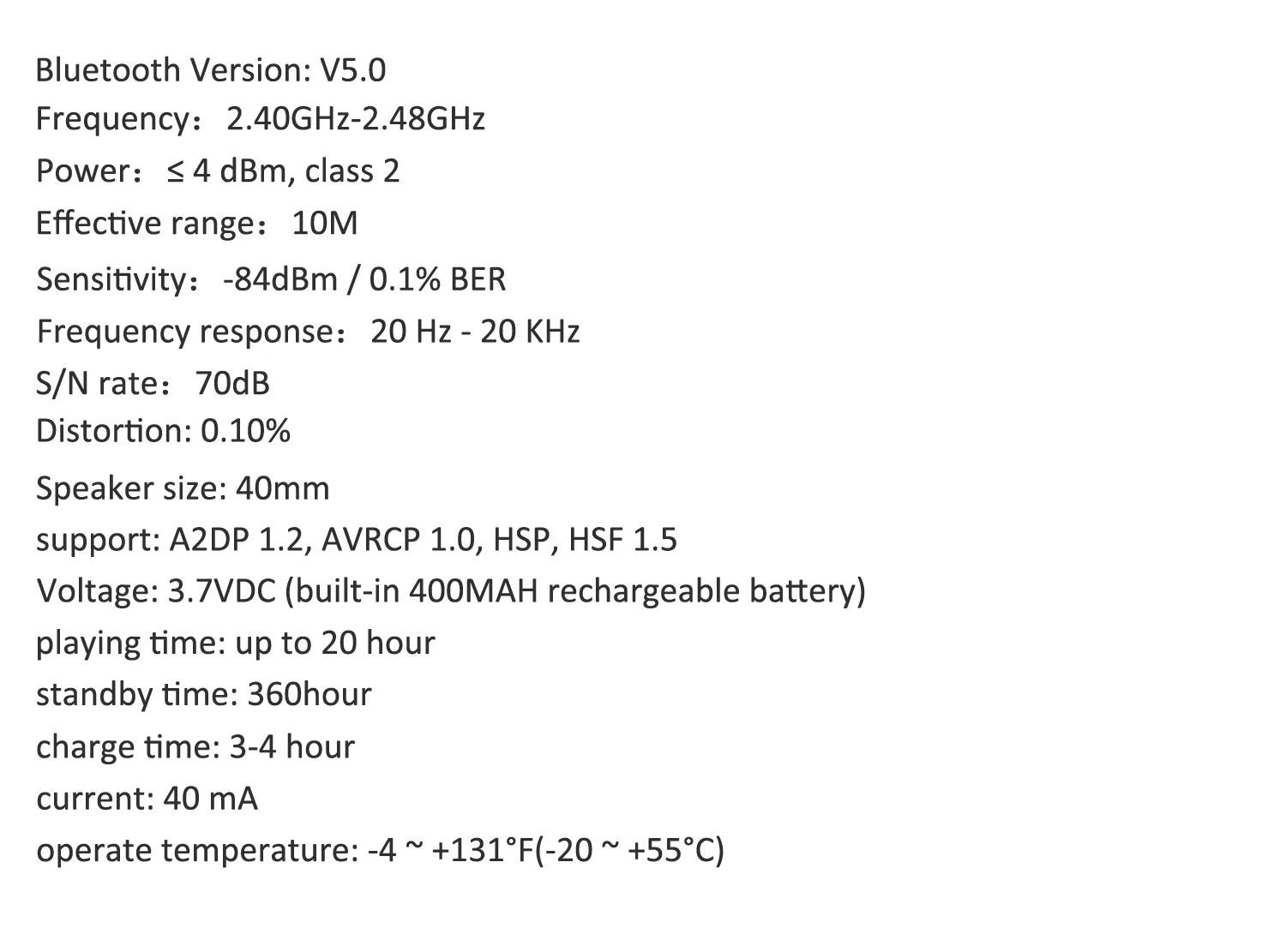 Voltage3.7VDC (built-in 400MAH rechargeable battery)