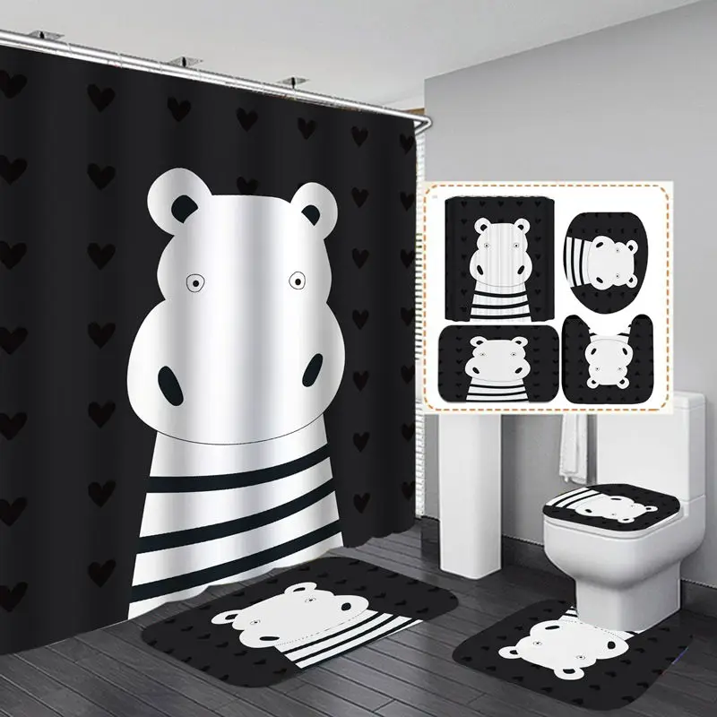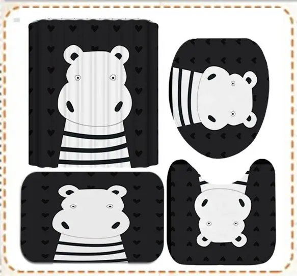 Симпатичная мультяшная черная занавеска для душа из полиэстера в виде маленького бегемота, нескользящий коврик для ванной, крышка для туалета, коврики, домашний декор для ванной комнаты