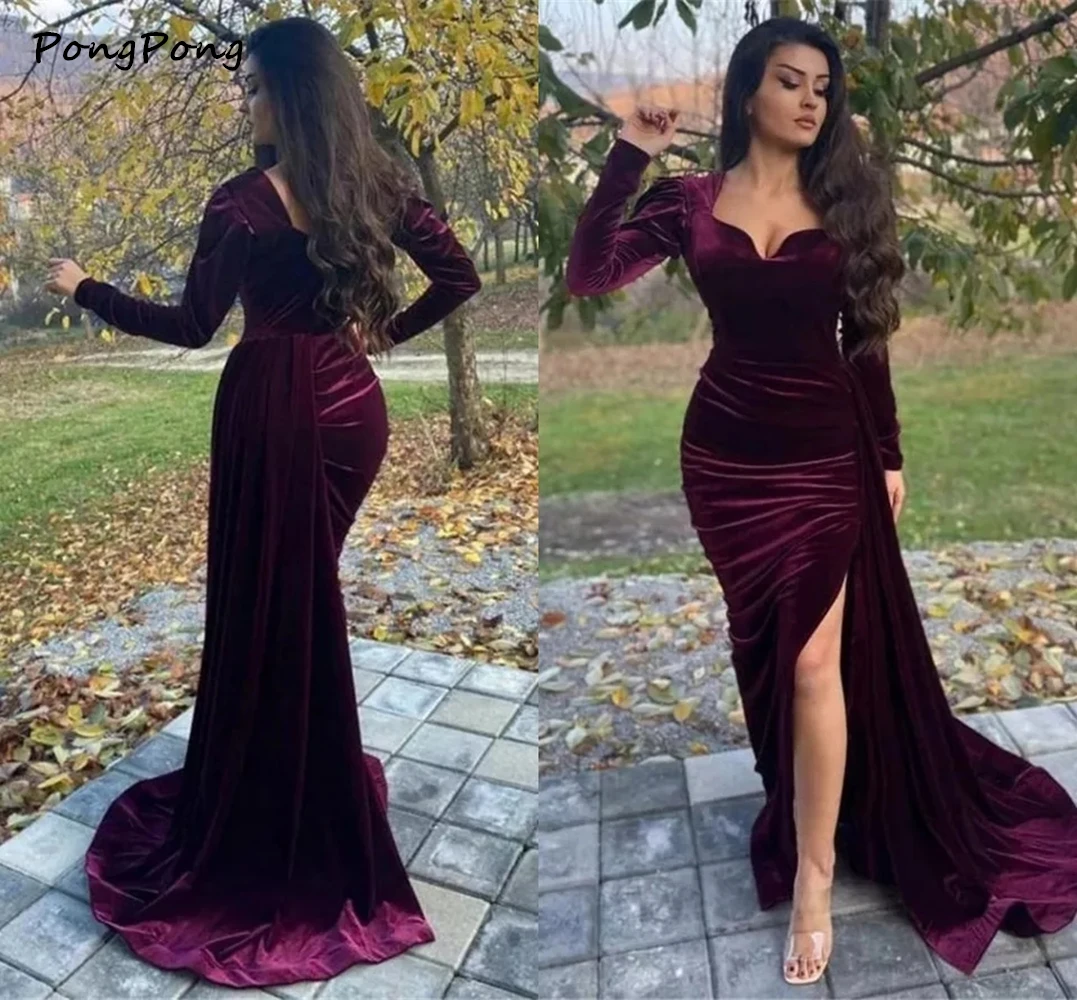 Вечерние платья-русалки с высоким Боковым Разрезом и длинным рукавом, официальные вечерние платья, бархатные платья-футляры до пола, праздничные платья