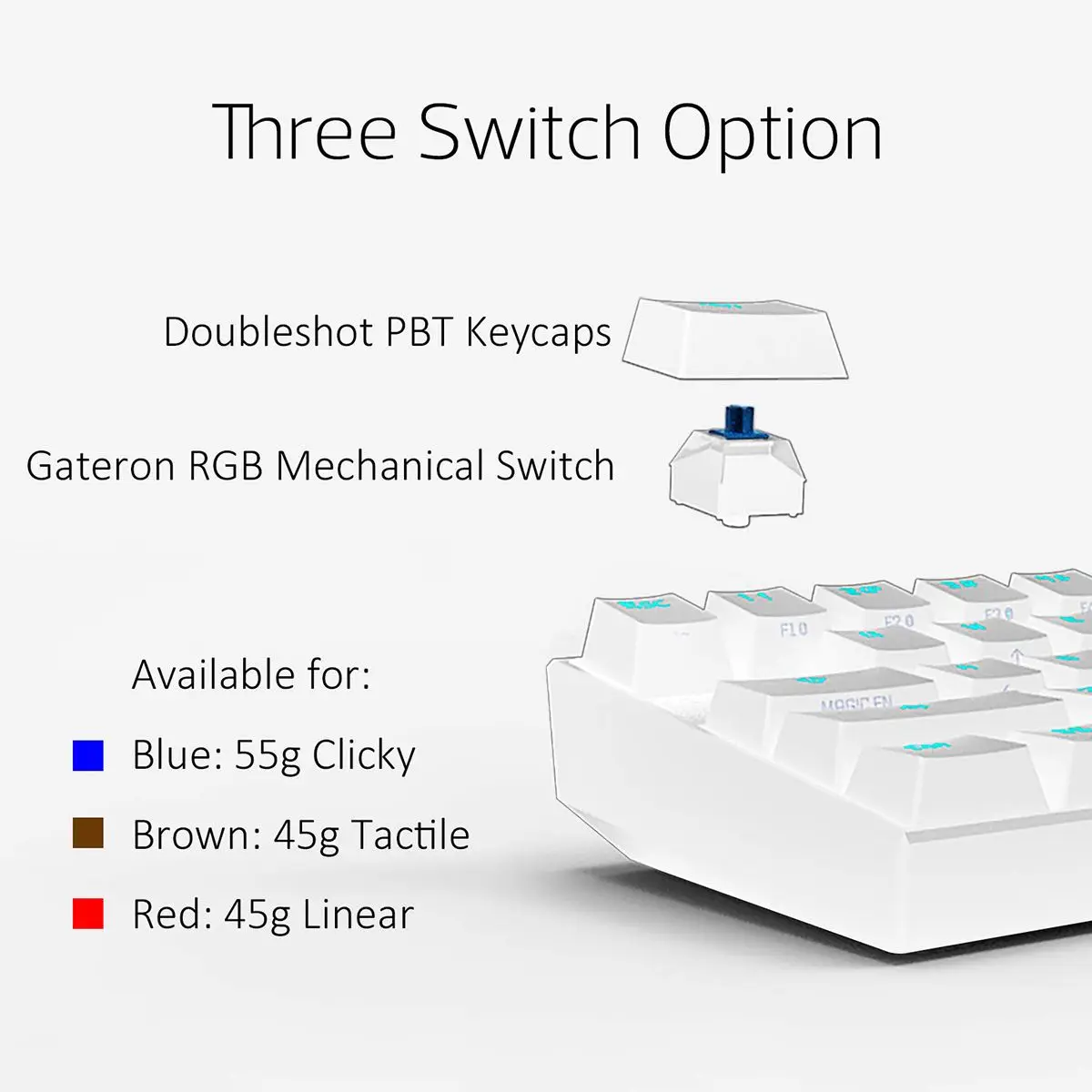 Особенности:-Двухрежимное соединение. Bluetooth 5,0 и двухрежимное соединение Type-C USB-C, делает его широко совместимым с несколькими системами, для Mac, iOS, Windows, Linux и Android.-Двойной FN. Двойная клавиша FN (FN1/FN2), которая создает больше возможностей для установки функции слоя.-Интеллектуальная функция «Tap Key» и «Magic Fn».Tap Fucntion: «Правый сдвиг», «FN1», «FN2», «Правый Ctrl» в комбинации, как клавиша крана, вы можете установить функцию слоя крана, И когда вы нажимаете клавишу TAP, он будет перемещать эту функцию слоя. По умолчанию они ведут себя как клавиша со стрелкой при прослушивании.Функция Magic Fn: сохраняя оригинальную функцию CapsLock, волшебная клавиша может копировать функцию FN1 или FN2, что дает вам быстрый доступ к медиа. Это означает, что magic fn может действовать как FN ключ. Вы можете установить слои fucntion для FN1/FN2, настроить любые клавиши или даже создать Макрос для комбинации клавиш через стартер Obinslab, и функция Magic Fn может отображать это поведение Fn.-Долгий срок службы. Аккумулятор большой емкости 1900 мАч, встроенная схема защиты предотвращает повреждение батареи.-Keycaps PBT. Doubleshot PBT keycaps, прочный и не легко блестит, как ABS keycaps.-Полная подсветка RGB. Полный RGB подсветкой, каждая клавиша может быть установлена RGB подсветкой независимо.-Большая Встроенная память для настройки. Программируемые Все клавиши, встроенная Встроенная память большой емкости для настройки функций TAP/Magic FN, настройка эффекта на светильник, настройка раскладки клавиатуры и настройки marco.