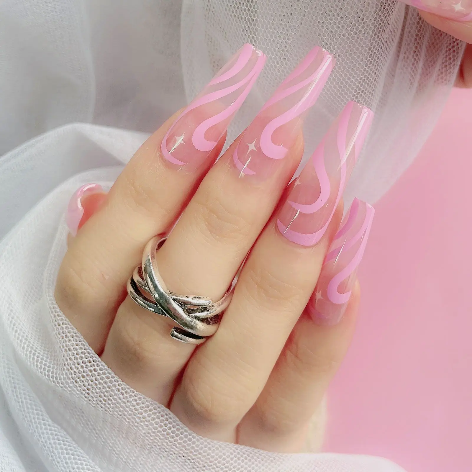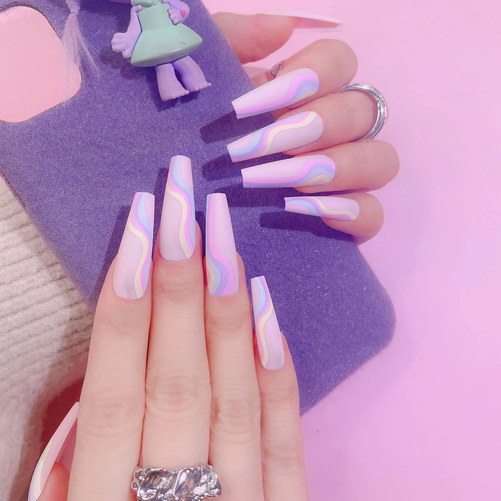 Накладные ногти с очень длинным волнистым узором, пригодные для ношения французские балерины, гроб, накладные ногти с полным покрытием, Типсы для дизайна ногтей с клеем для прессования, 24 шт.