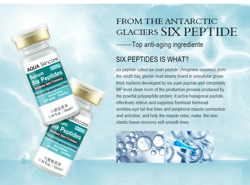Шесть пептидов-это что? Шесть пептидов, называемых шестью юанями пептидов (эссенция арегинина), штаммы ледников из Южной бухты, обнаруженные в одноклеточных зеленых толстых бактериях, разработанных шестью юанями пептидов, И completelyMP уровень чистой комнате производственного процесса производится bythe порошковый полипептидный Белок: Он активен шестигранным пептидом, эффективно снимает и подавляет морщины лба, тонкие линии вокруг глаз и сокращения периферических мышц и деятельности, а также помогает расслабить мышцы, делает кожу упругой, восстанавливая мягкие гладкие линии.