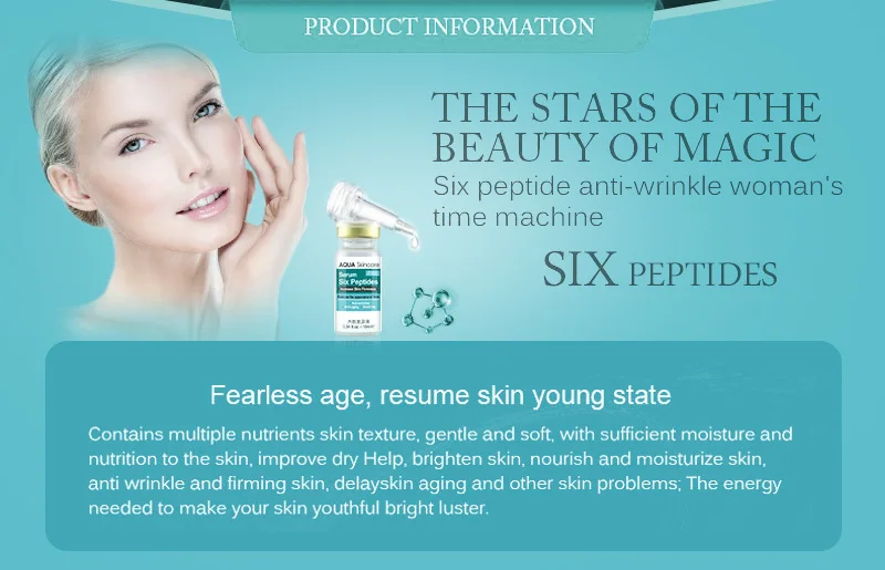 Шесть пептидов против морщин для женщин, шесть пептидов Бесстрашного возраста, восстанавливает молодое состояние кожи, содержит множество питательных веществ, мягкое и мягкое, с достаточным количеством влаги и питанием для кожи, улучшает сухость, осветляет кожу, питает и увлажняет кожу, против морщин и укрепляет кожу, delayskin aging и другие проблемы с кожей; Энергия, необходимая для того, чтобы сделать вашу кожу молодой яркой.