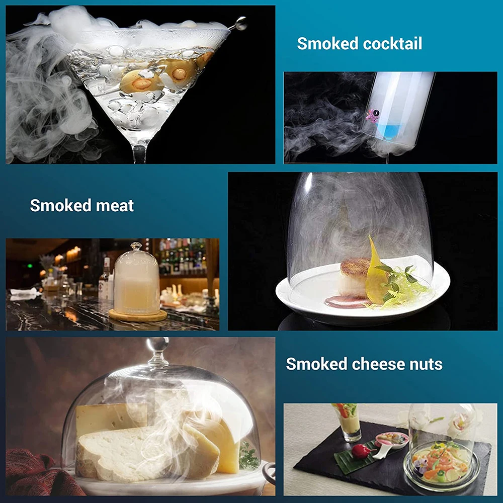 Специальное назначение продукта: рыба, морепродукты, молекулярная кухня, коктейли, ореховые закуски (курительная пушка быстро использует различные виды опилок, чая, трав, специй, сена, И высушенные цветы для дыма. Для добавления холода в еду или напитки требуется всего 3-5 минут. Дым и аромат)