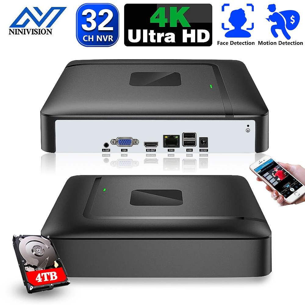 NINIVISION 4K 32CH NVR 8MP H.265 распознавание лица XMEYE Rj45 сетевой видеорегистратор 9CH 16CH NVR система безопасности камеры P2P