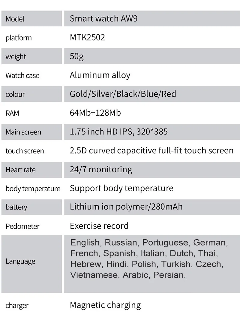 Чип: MTK2502CРазмер экрана: 1,75 IPSПамять: ram64M + rom256MРазрешение: 320*385 пикселей высокое разрешениеАккумулятор: 280 мАЦиферблат: цинковый сплавУправление: сенсорный + клавиша вращенияBluetooth: 3,0/4,0 Bluetooth двойная частотаРемешок: ТПУРазмер ремешка: 40 ммРазмер часов: 42*36*12 ммЯзык поддержки:Тайский иврит хинди польский турецкий английский Чешский вьетнамский русский арабский Португальский Итальянский Немецкий Французский Испанский персидскийОсобенности часов:Динамический циферблат, функция масштабирования, боковой кнопочный переключатель, bluetooth-вызов, Интеллектуальное обнаружение, обнаружение температуры тела, режим упражнений, напоминание о информации, сон, поднимите руку, чтобы осветить экран, будильник, настройка циферблата, напоминание о сидячем положении, счетчик шагов, секундомер, отображение времени, получение SMS, напоминание о звонках, Запись упражнений, запись звонков, пульс, кислород крови, анти-потерянный телефон, управление музыкой, пользовательские обои, умный голос, погода.Метод зарядки часов:Зарядное устройство + защитный чехол для часов (когда вы снимаете часы для зарядки, не допускайте падения и поломки важных частей, таких как экран)