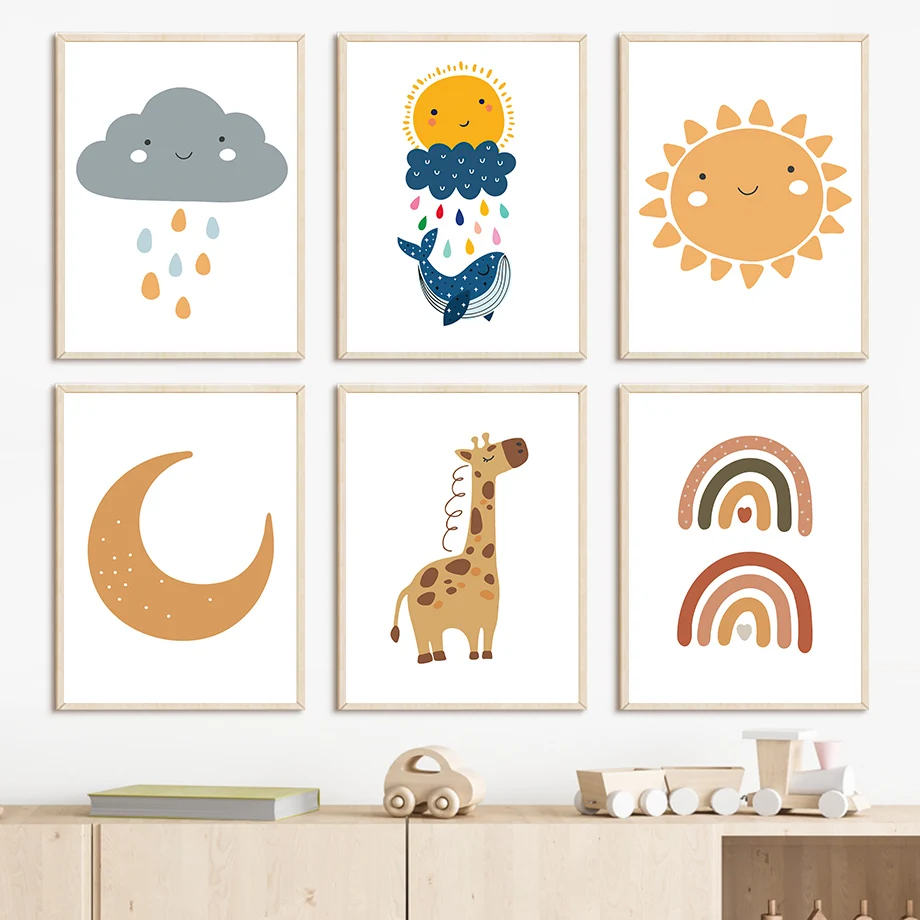Мультфильм солнце облако КИТ Жираф Луна настенный Арт холст живопись скандинавские плакаты и принты детские настенные картины для детской комнаты декорМатериал: экологически чистый хлопокХарактеристика: солнцезащитный, водонепроницаемый, никогда не выцветает