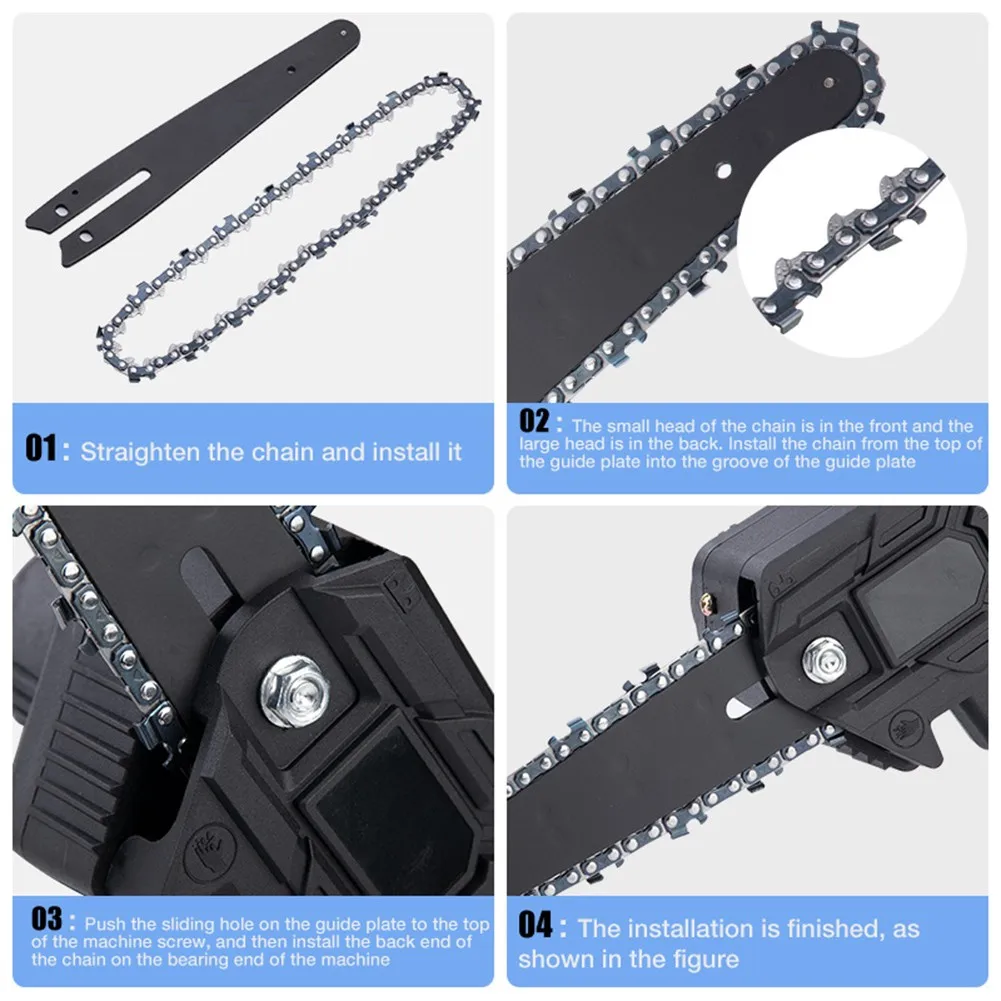 2. Цепь цепной пилы и аксессуары направляющих колес изготовлены из высокоскоростной стали 65Mn, с высокой твердостью, быстрой скоростью нарезки и улучшенной эффективностью.