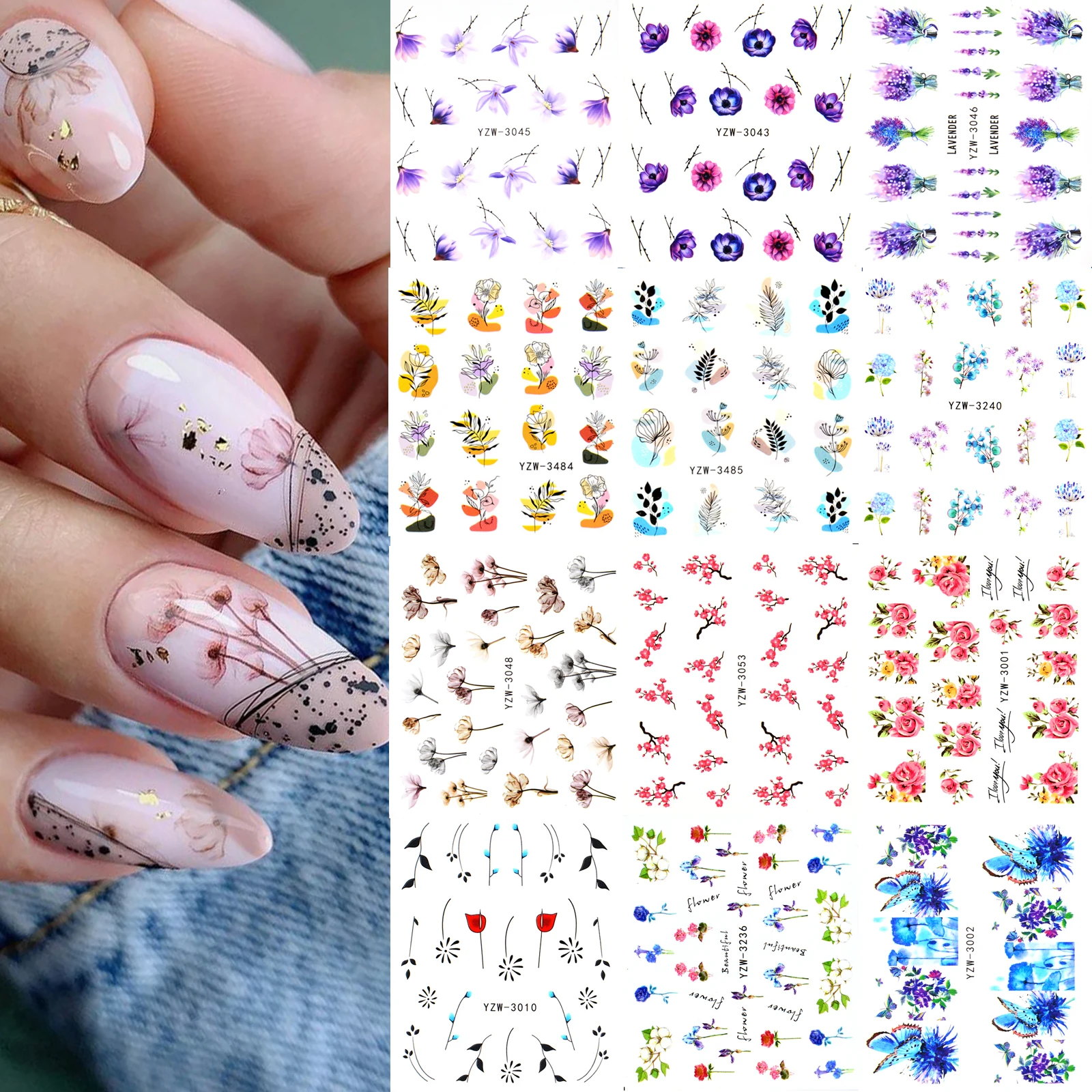 12 шт. Компл. Фиолетовые цветочные листья водные наклейки и наклейки для дизайна ногтей украшение для дизайна ногтей синяя бабочка переводной слайдер для ногтей