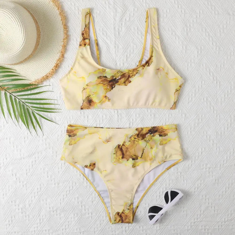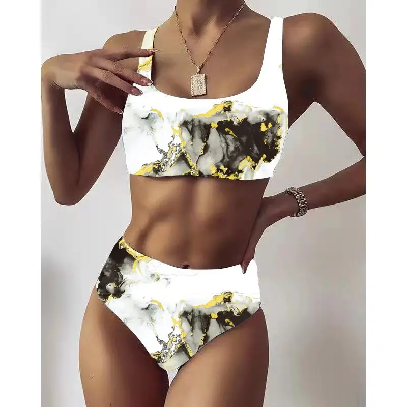 2021 международная торговля Новинка мраморный цветочный узор разрез Высокая талия U-образный вырез сексуальный женский купальник бикини
