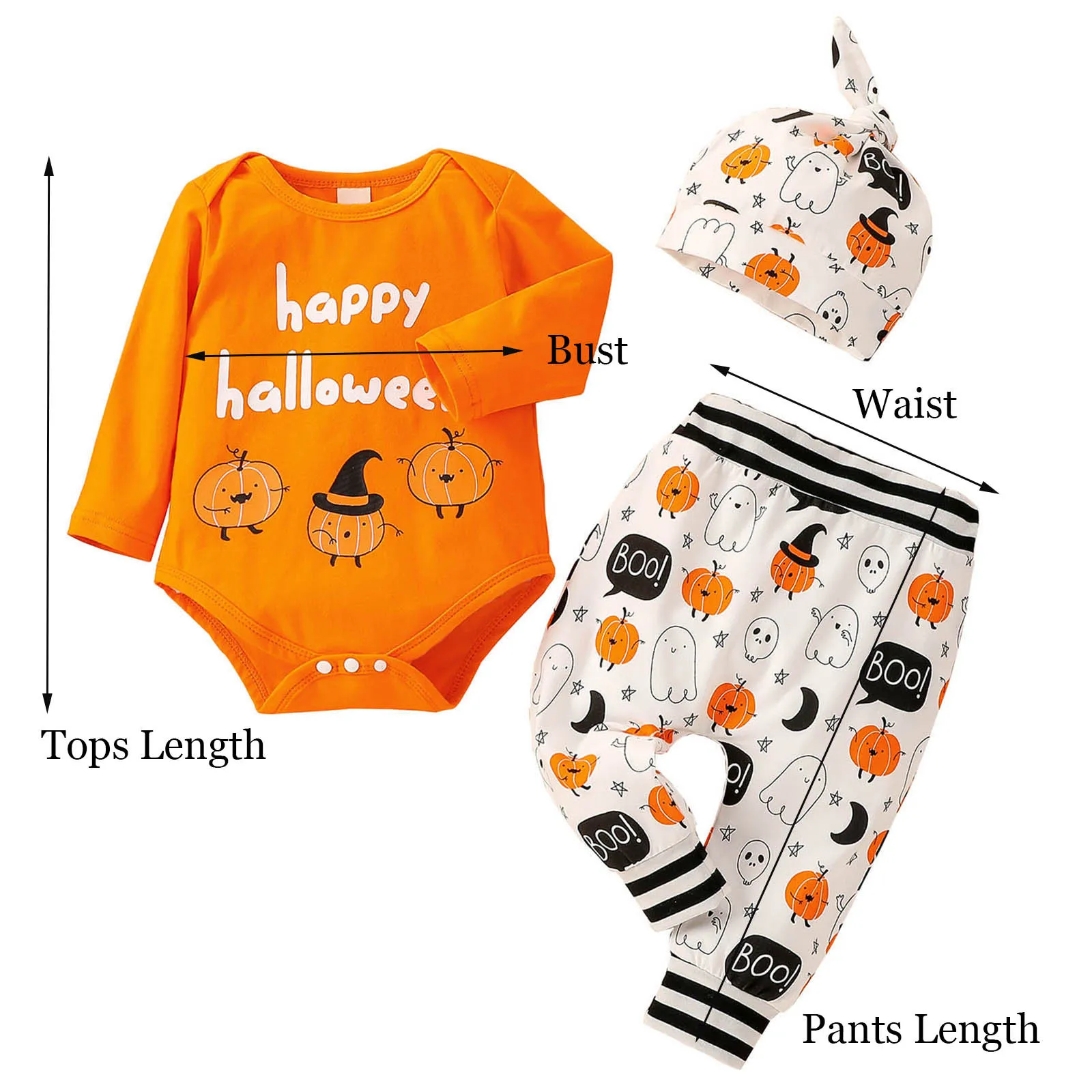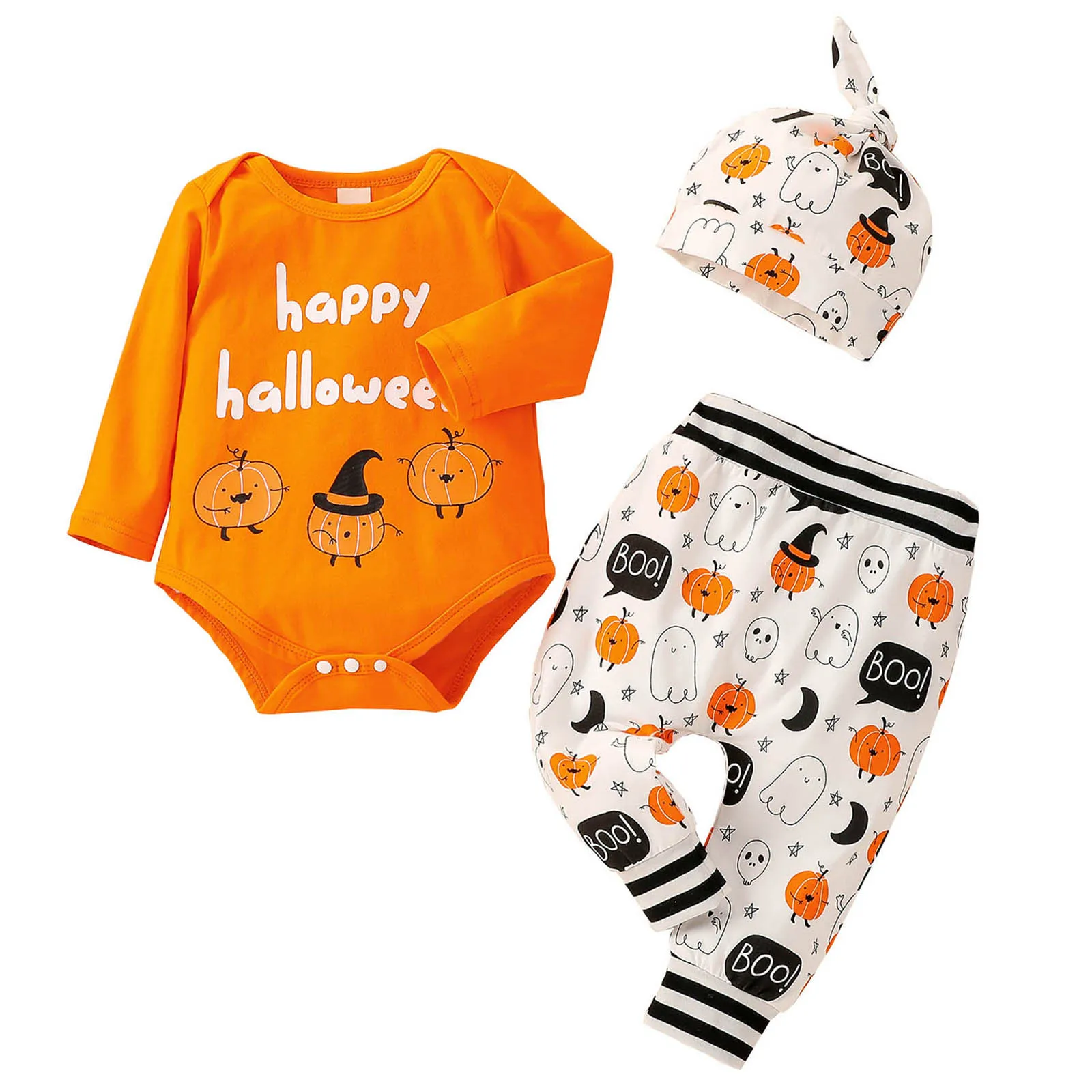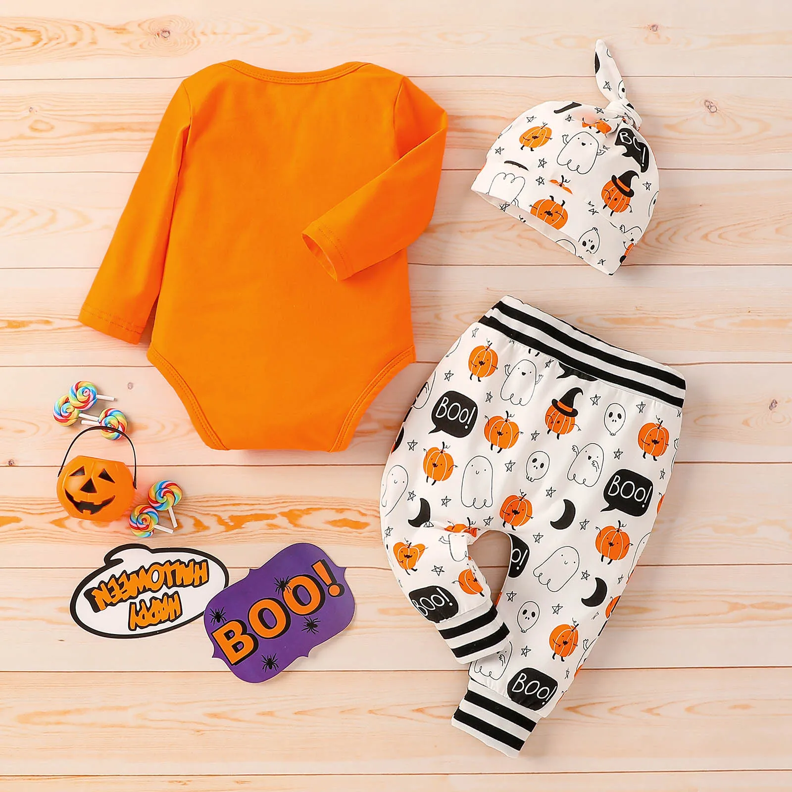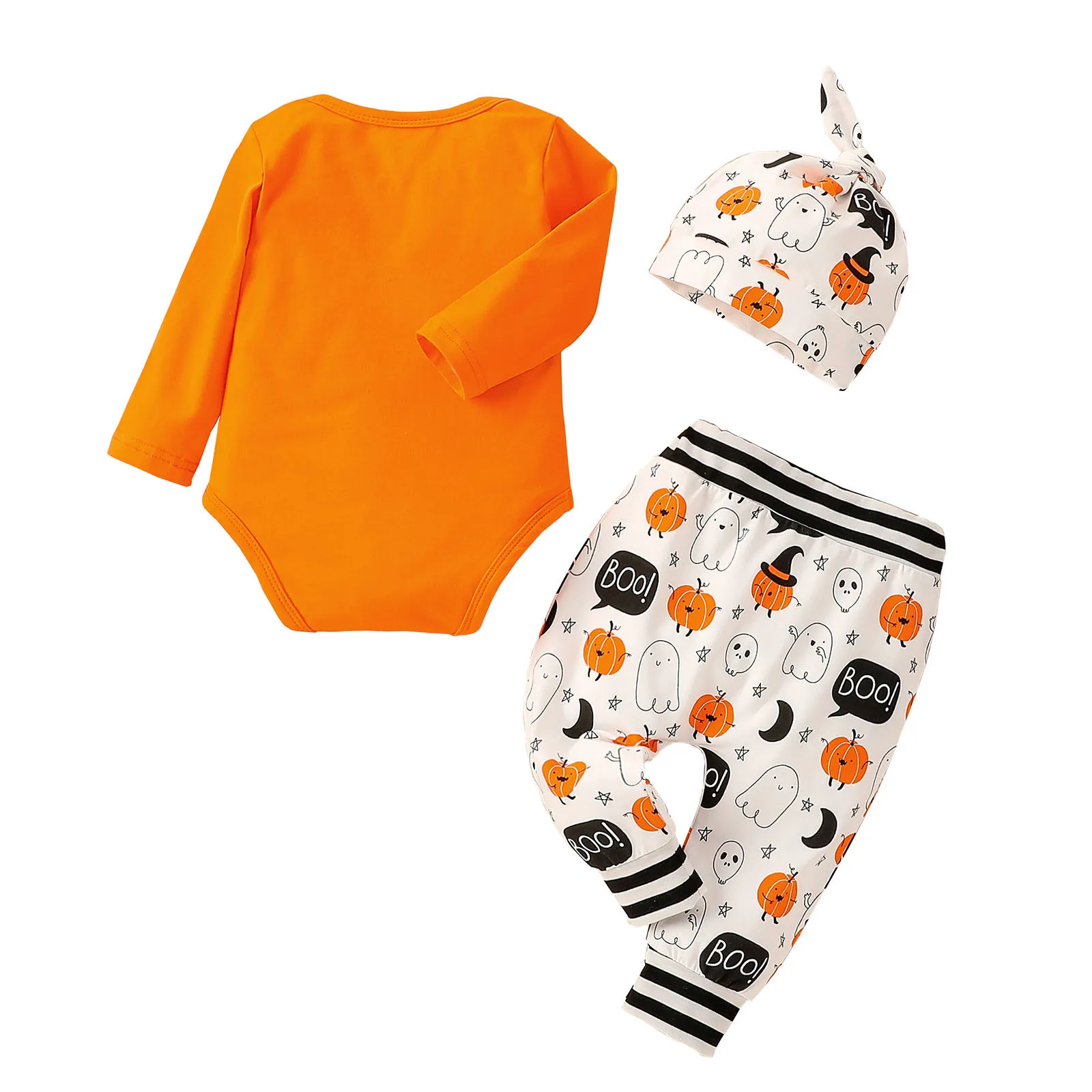 Комплект одежды для маленьких мальчиков и девочек, комбинезон с длинным рукавом и буквенным принтом на Хэллоуин, боди + штаны с тыквой + шапка, 3 предмета, Детские наряды