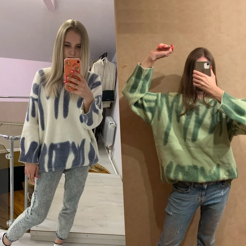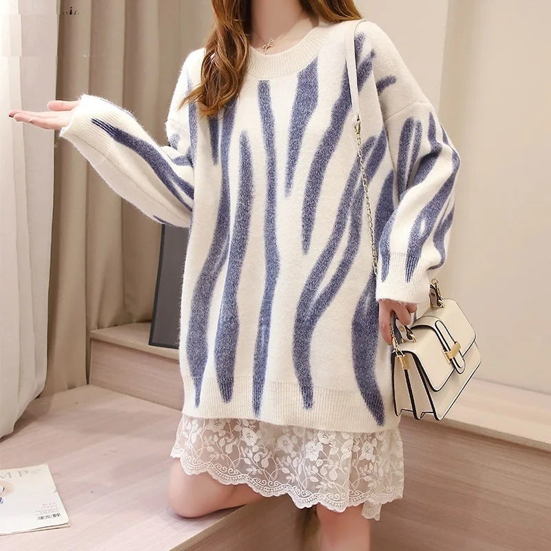 Пуловер женский зимний оверсайз с круглым вырезом и принтом в полоску
