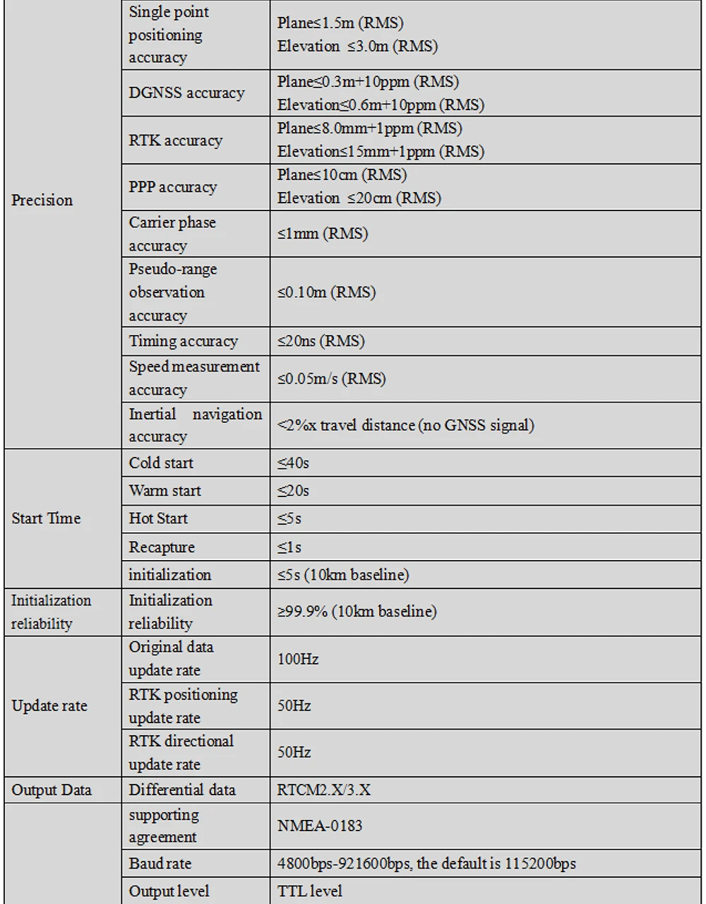 RTK accuracyPlane≤8.0mm+1ppm (RMS) Elevation≤15mm+1ppm (RMS)